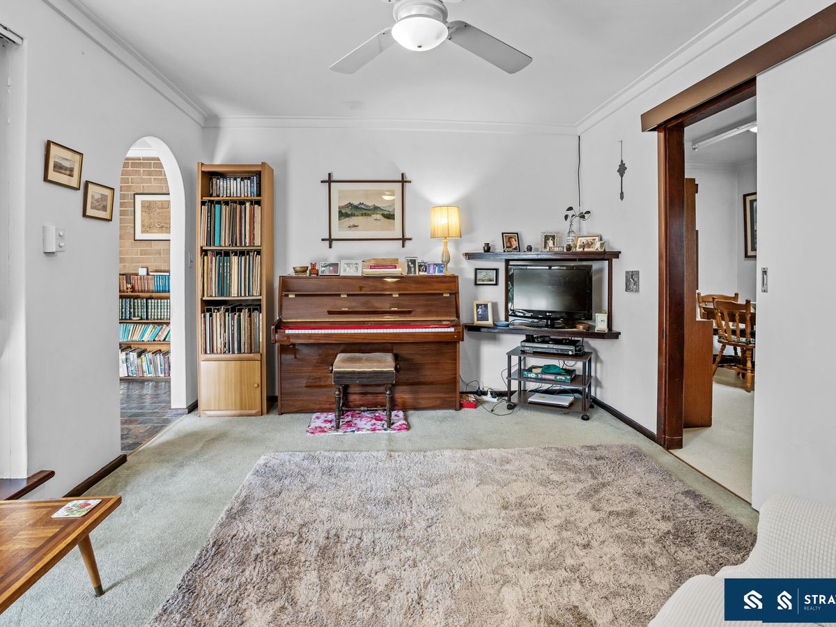 Step inside to find a secure and comfortable home with a security screen door and alarm system. The living room is bright and inviting, featuring carpet flooring, a ceiling fan, split system air-conditioning, and a gas bayonet heater connection.