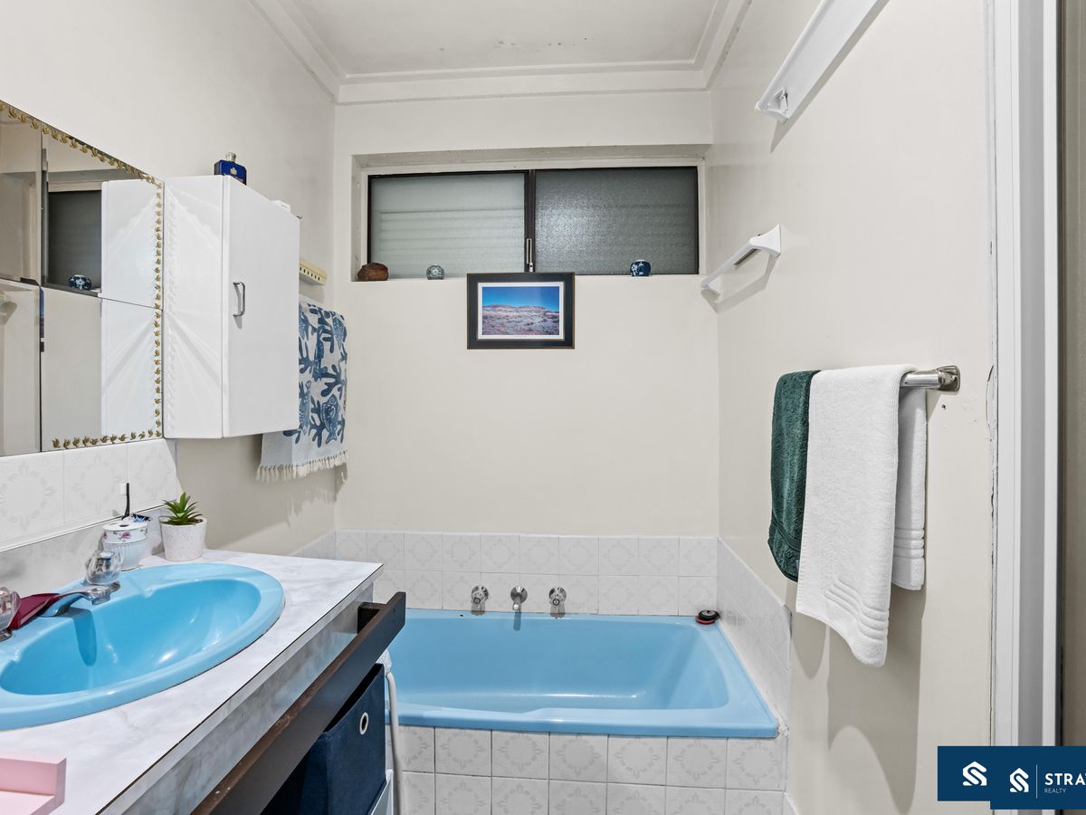 The bathroom includes a vanity, heat light, shower, and bathtub, with a separate toilet and a built-in linen cupboard conveniently located in the hallway. The laundry provides direct access to the backyard for ease of use.