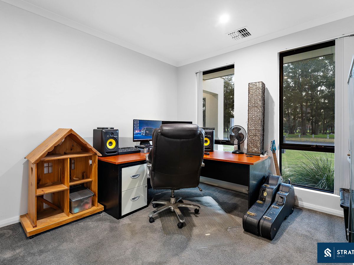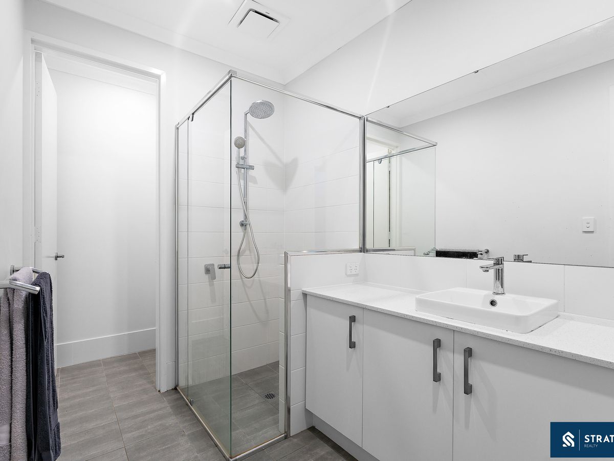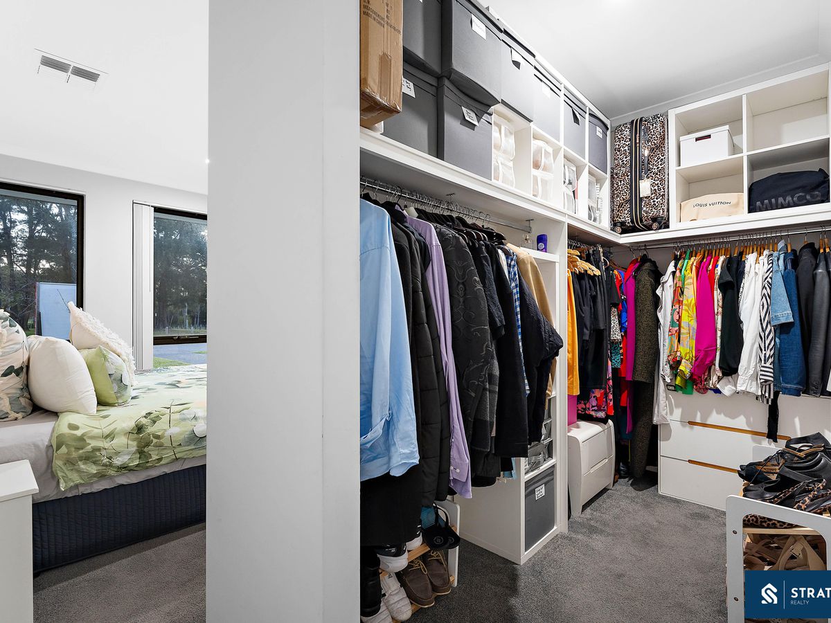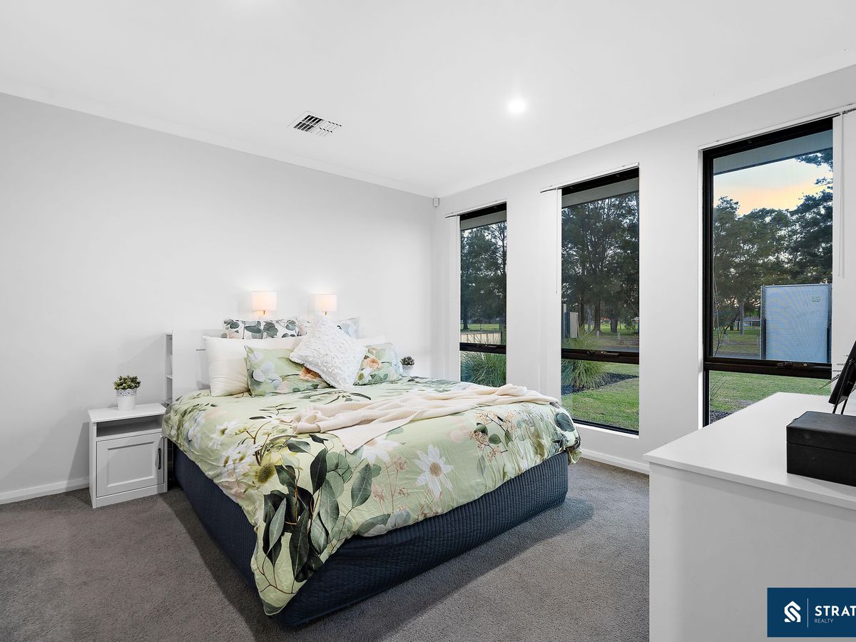 Wake to green views in the spacious master suite, where a lofty ceiling frames an outlook across the park. It's complemented by LED downlights, a walk-in robe, and a sleek ensuite with stone-top vanity and shower. Three additional bedrooms are all generously sized and fitted with mirrored built-in robes, serviced by a roomy main bathroom with shower and bathtub plus a separate toilet.