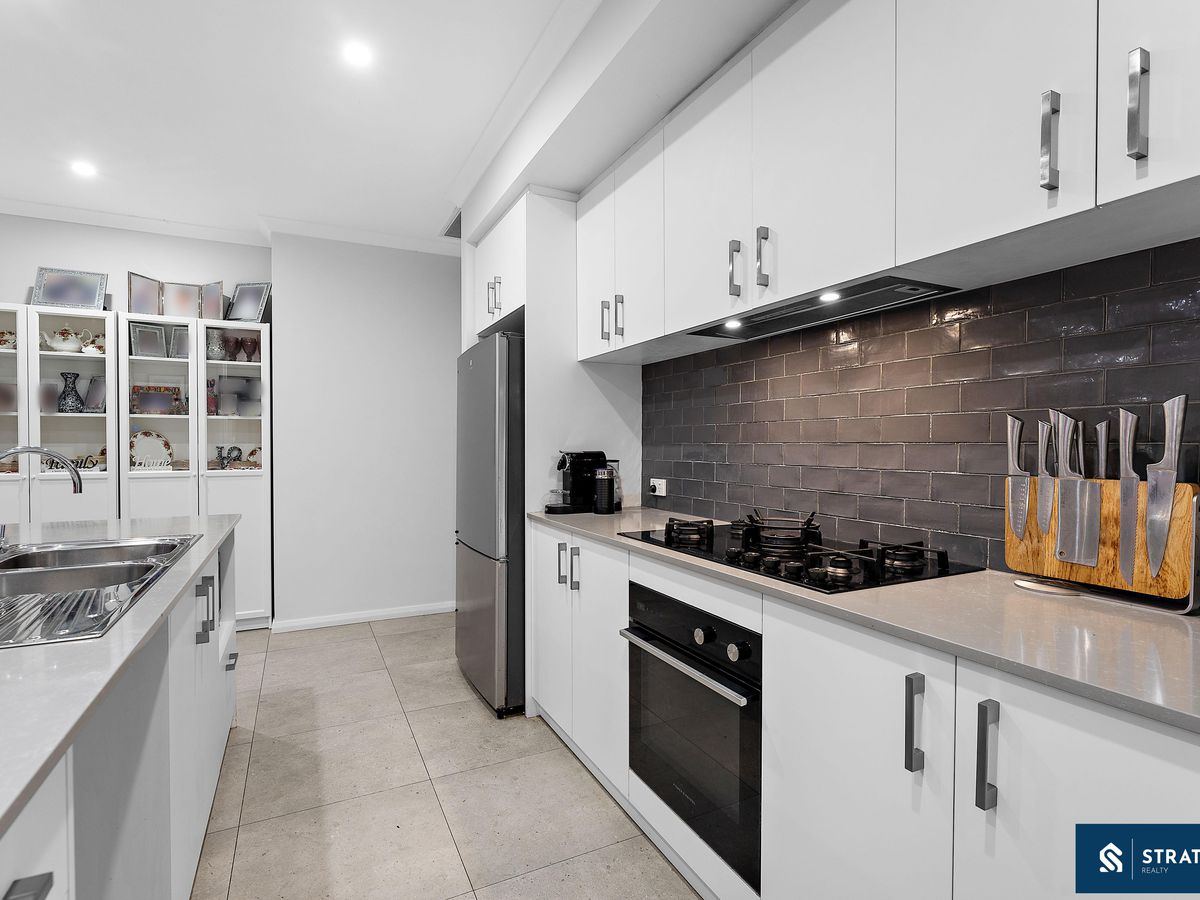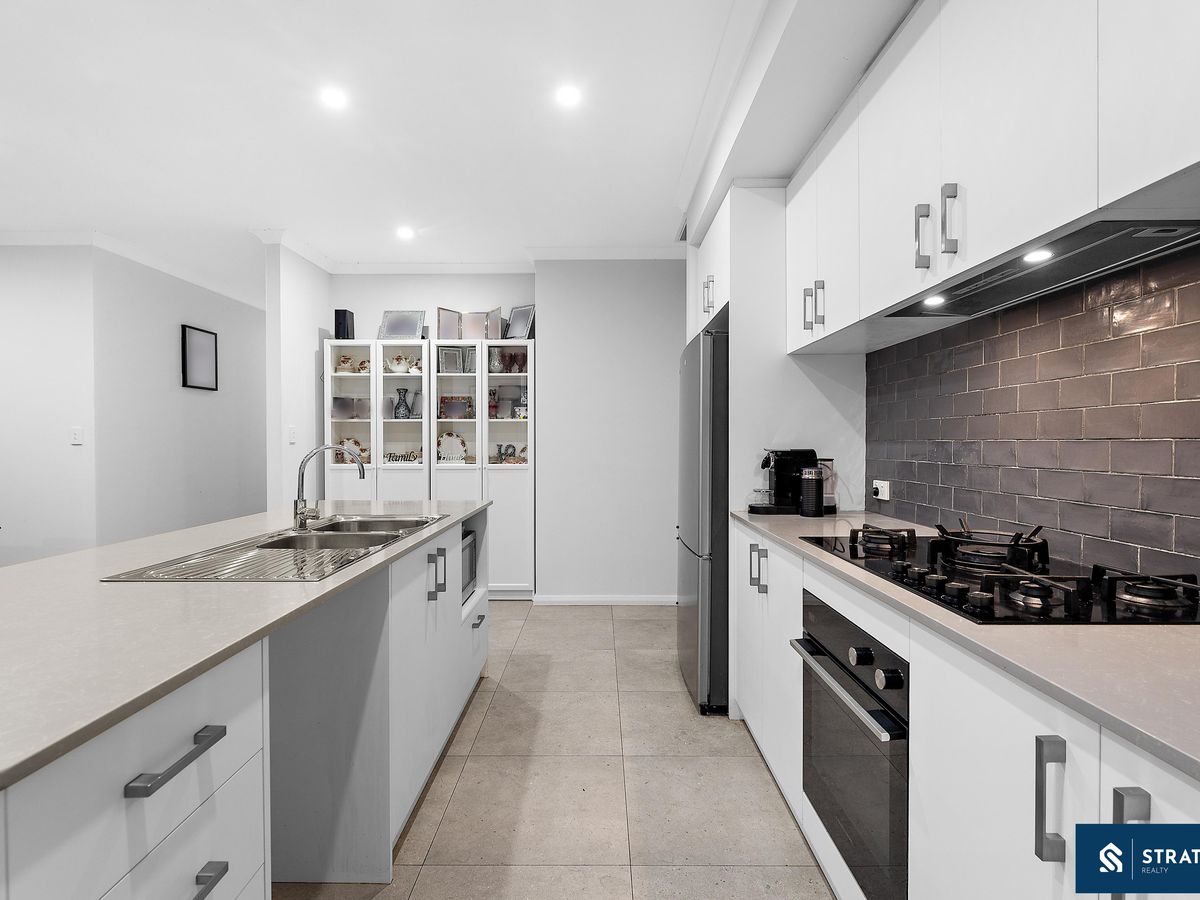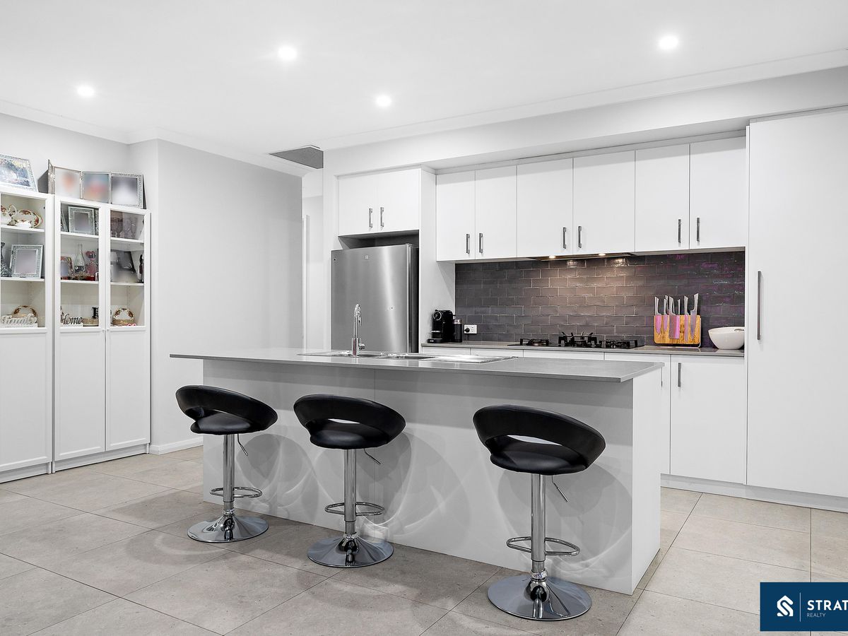 The heart of the home is a light-filled, high-ceilinged open-plan living/meals/kitchen zone dressed with LED downlights. The stylish kitchen features a stone benchtop, 900mm gas cooktop, built-in pantry, and a handy shoppers' entrance directly from the double garage. A separate laundry with built-in linen keeps the day-to-day beautifully organised.