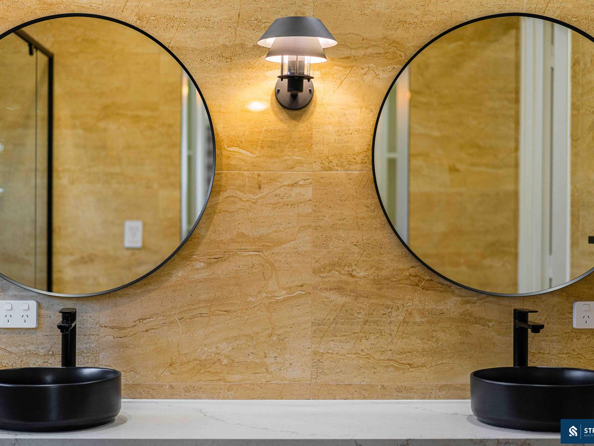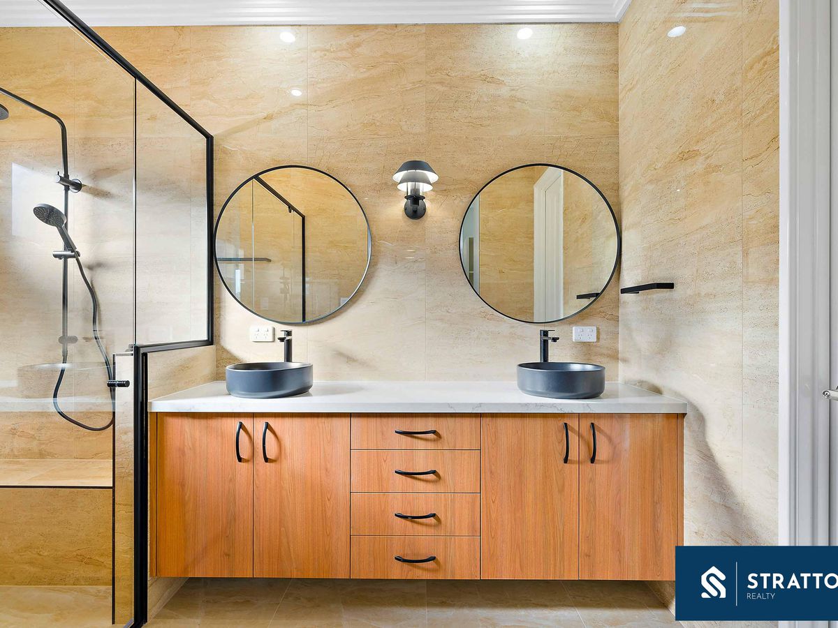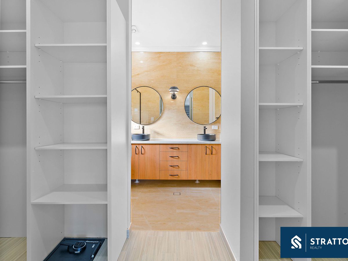 The king-sized master retreat impresses with his-and-hers walk-in robes (featuring a built-in safe) and a sumptuous ensuite boasting twin vanities, black designer accents, and a massive walk-in shower. Additional bedrooms feature built-in cabinetry, while the family bathroom continues the same high-end design with freestanding bath, recessed shower seating custom niche shelving, and seamless tiled drains and 3 W/C powder rooms for ultimate convenience.
