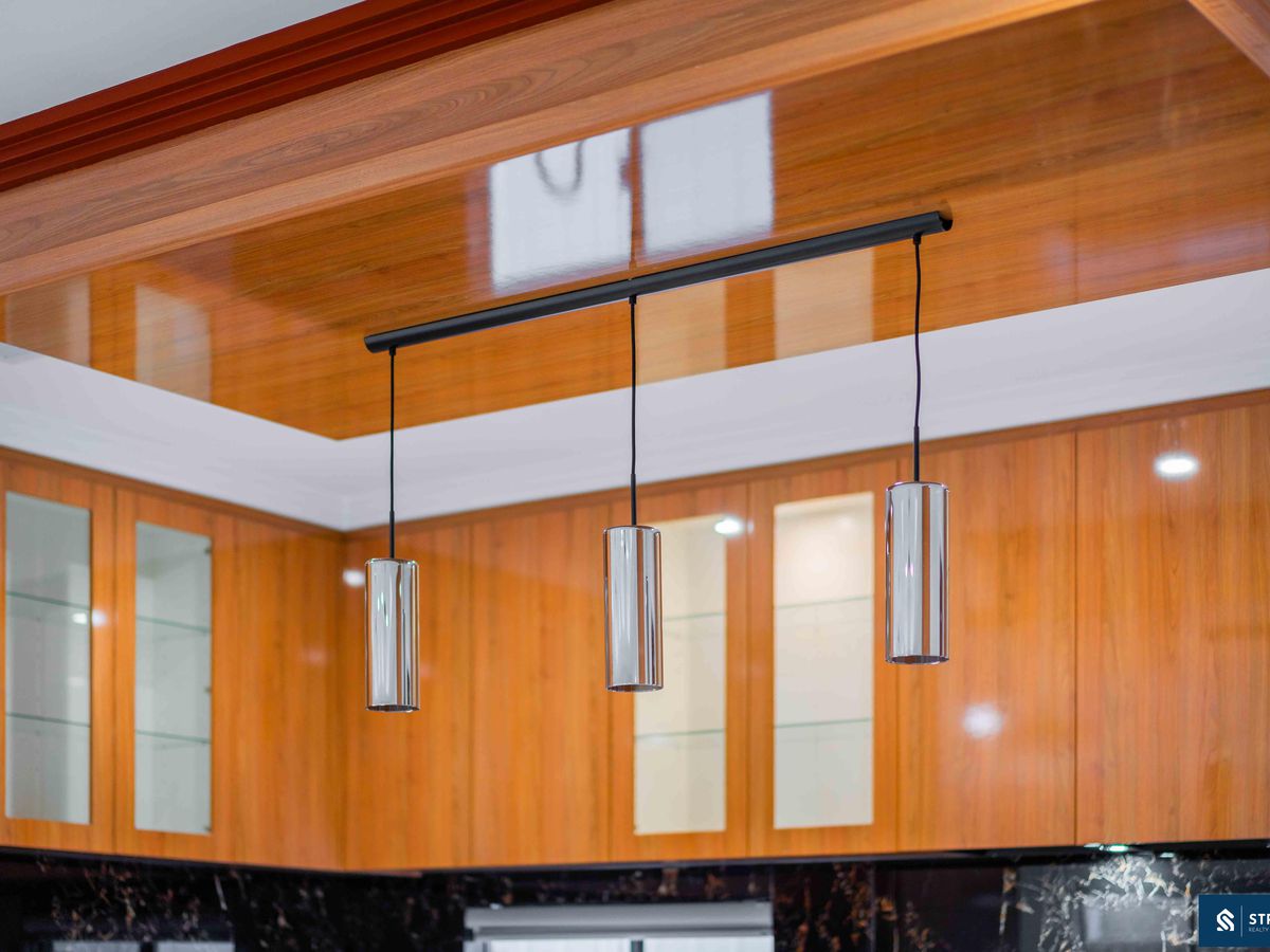 Custom Polytec cabinetry with gloss finish & glass showcase cupboards