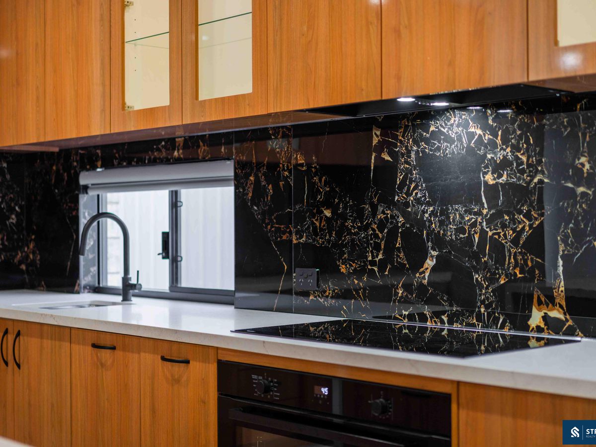 40mm waterfall stone benchtops across kitchens, bathrooms & laundry