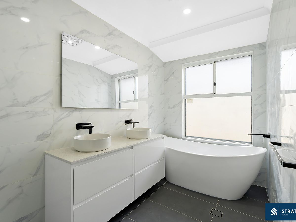 The bathrooms are fully tiled with sleek vanities, one featuring a freestanding bathtub for a spa-like experience.
