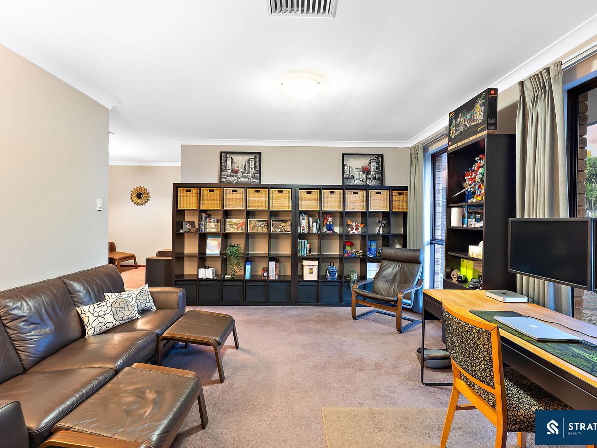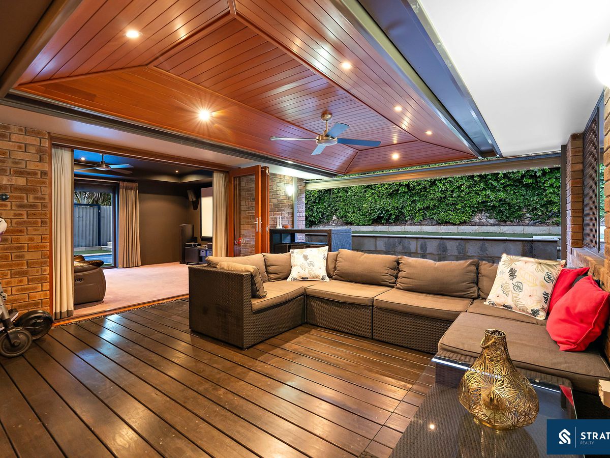 Movie nights are covered in the dedicated theatre room, complete with carpet, split-system a/c, ceiling fan, and roller shutters to the glass sliding door. When it's time to entertain, step out to the covered patio with ceiling fan and decking, complemented by side screens to close for year-round use. The laundry offers double-door built-in storage and direct access to the backyard.