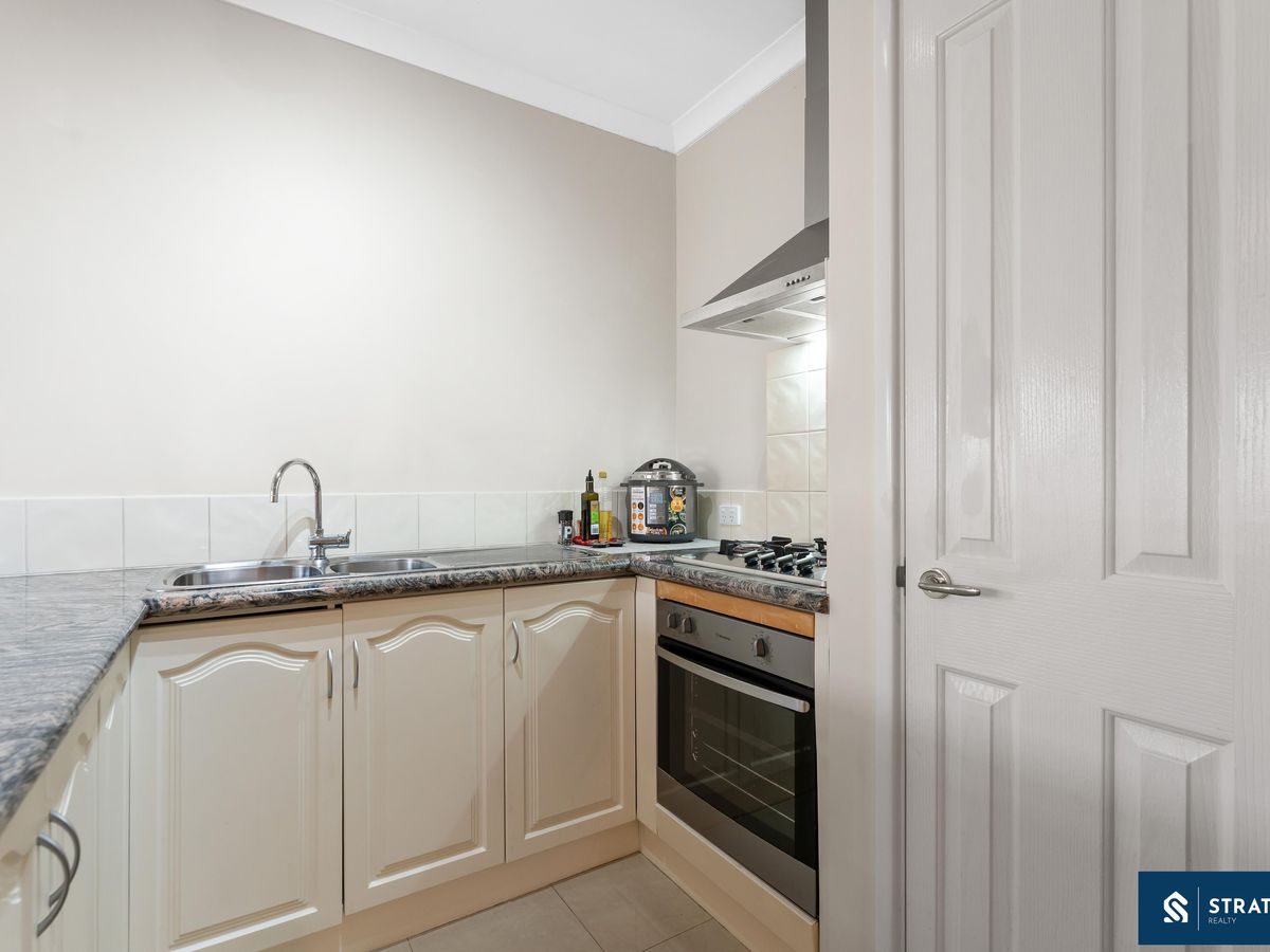 The home features a separate lounge plus an open-plan kitchen, meals, and family space, providing excellent flexibility. Comfort and security are well-catered for with roller shutters, alarm system, security door, split-system air conditioning to bedrooms, and an additional air-conditioning unit in the main living area. The kitchen includes stainless-steel appliances, pantry storage, and generous bench and cupboard space.