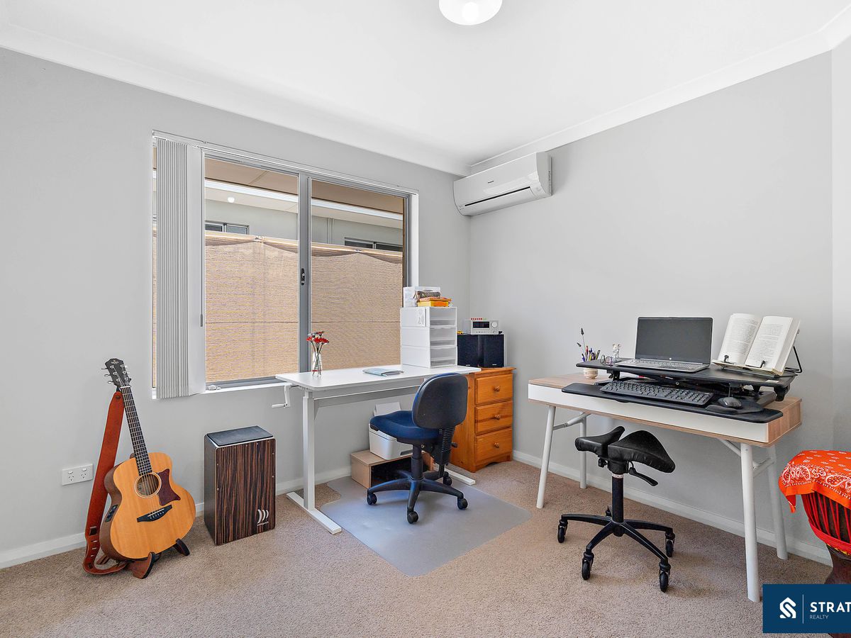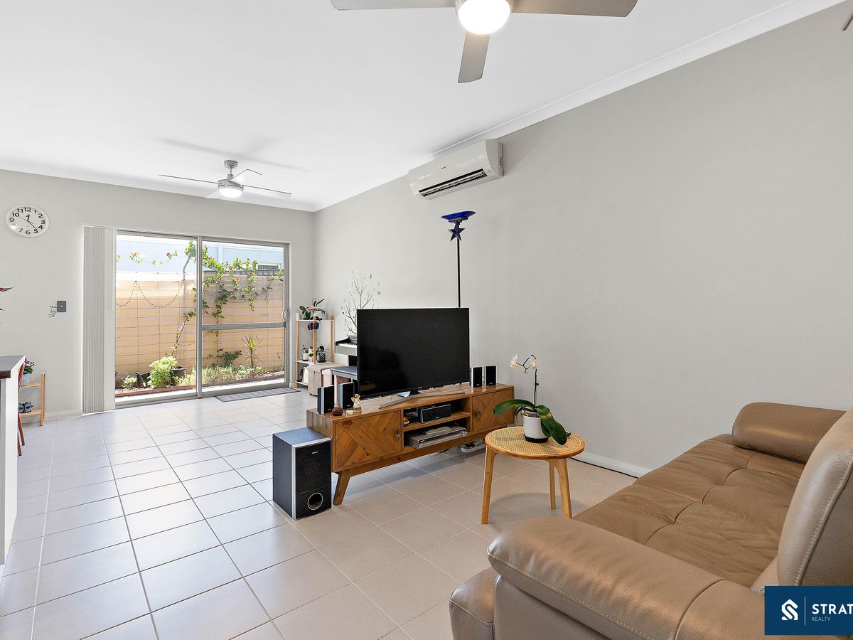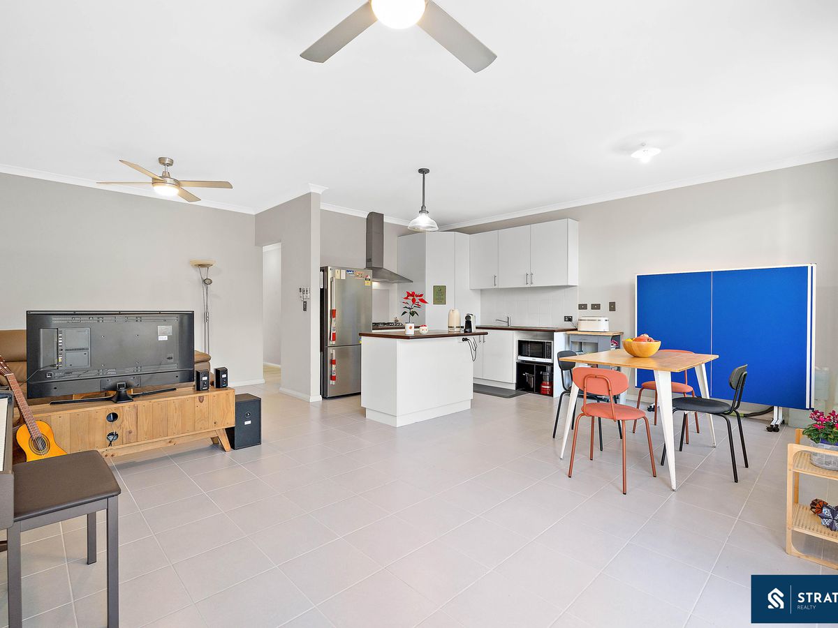 At the heart of the home is the open-plan living, meals, and kitchen area, complete with a gas cooktop, double sink, ceiling fans, and a split air-conditioning system, making it a welcoming space for everyday living and entertaining.