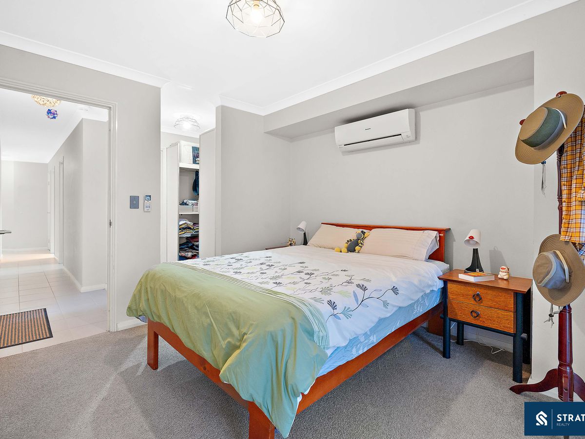 The master bedroom is generously sized and includes a walk-in robe, private en-suite with shower and toilet, and its own split air-conditioning system. The additional bedrooms are well appointed, with the second bedroom offering built-in robes and split air-conditioning, while the third bedroom also includes built-in robes. A main bathroom with shower and bathtub, separate toilet, and a linen cupboard in the hallway add further practicality.