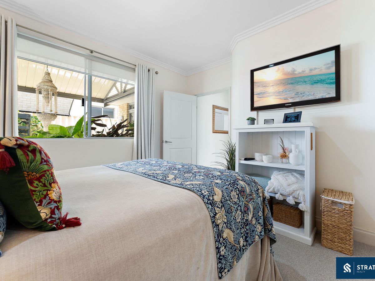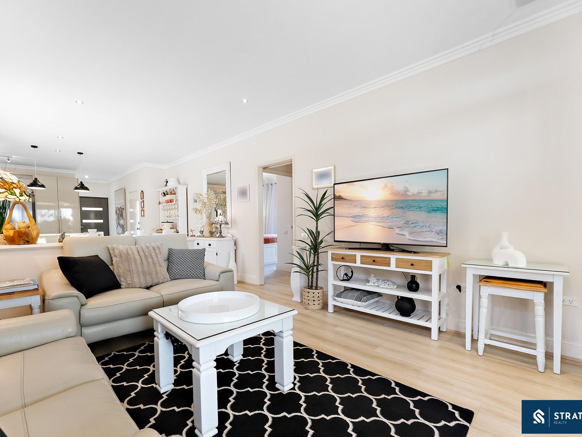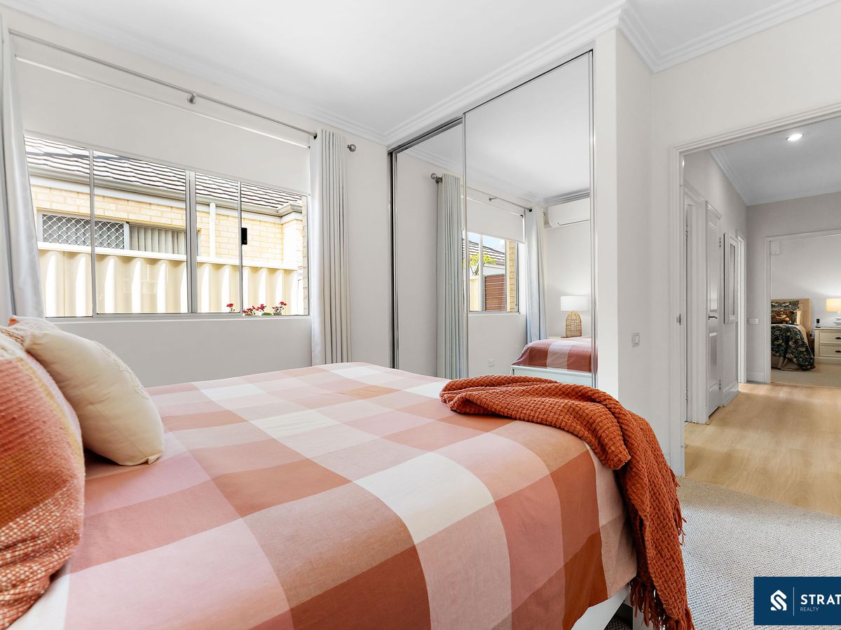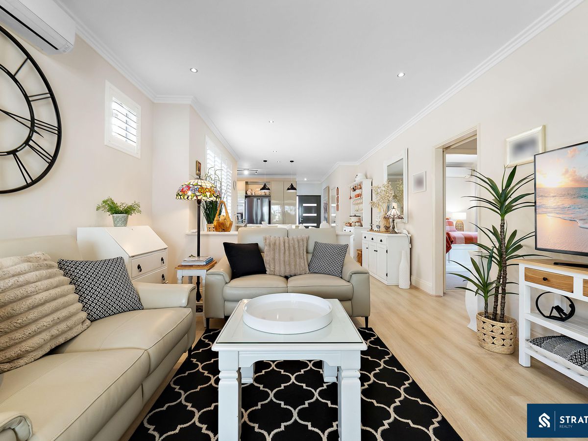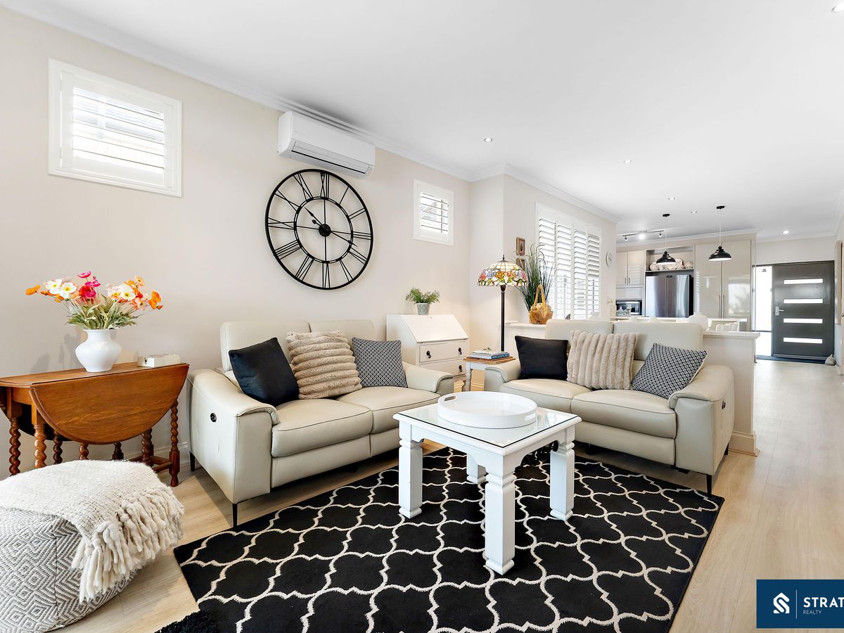 A secure front entry with a security screen welcomes you inside, where hybrid flooring flows throughout the home (excluding the bedrooms) and plantation shutters feature throughout, creating a cohesive and easy-care interior. The spacious front bedroom is well proportioned and includes carpet flooring, making it ideal for everyday comfort or use as a guest room.
