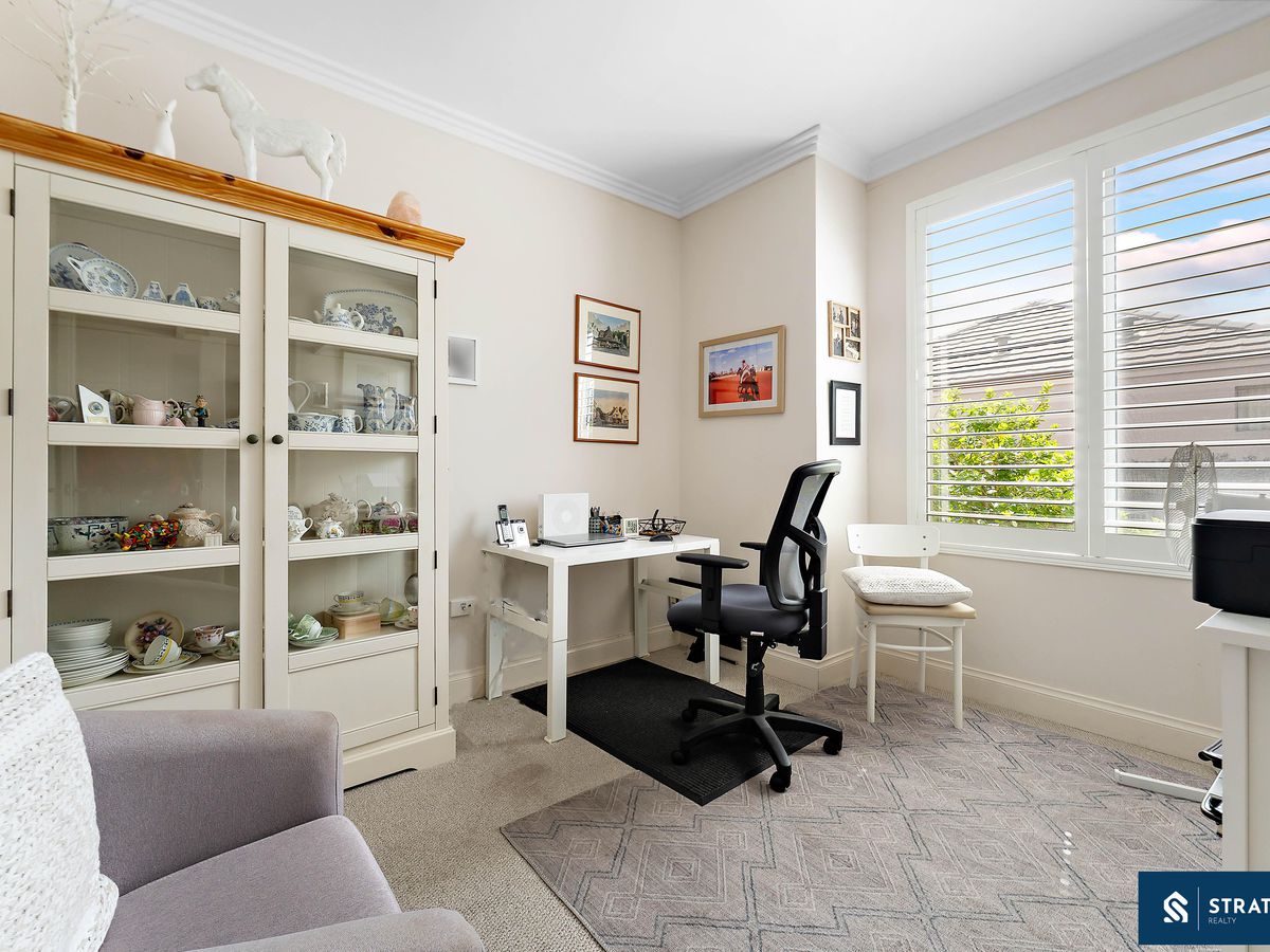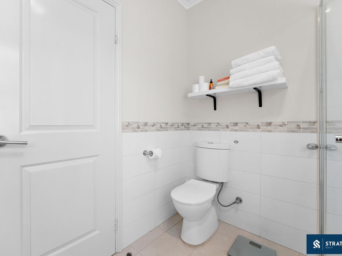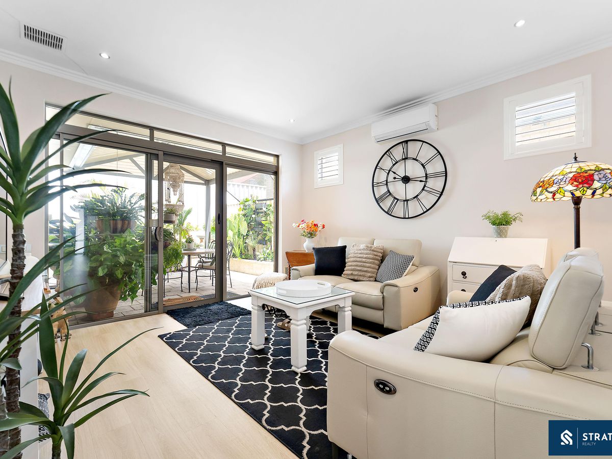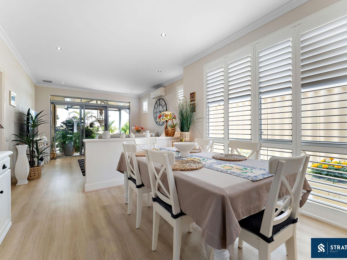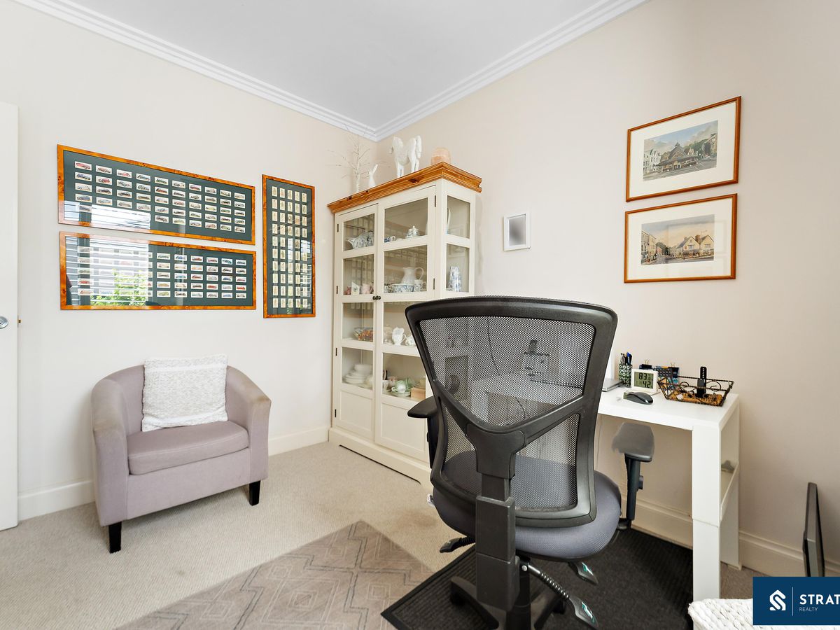 A secure front entry with a security screen welcomes you inside, where hybrid flooring flows throughout the home (excluding the bedrooms) and plantation shutters feature throughout, creating a cohesive and easy-care interior. The spacious front bedroom is well proportioned and includes carpet flooring, making it ideal for everyday comfort or use as a guest room.