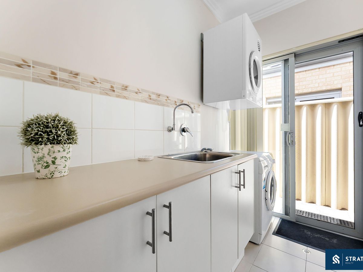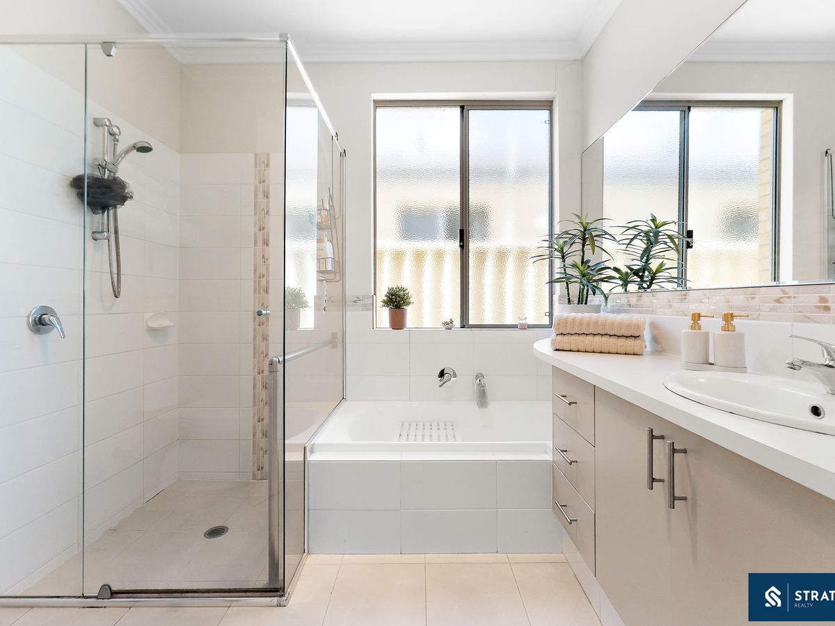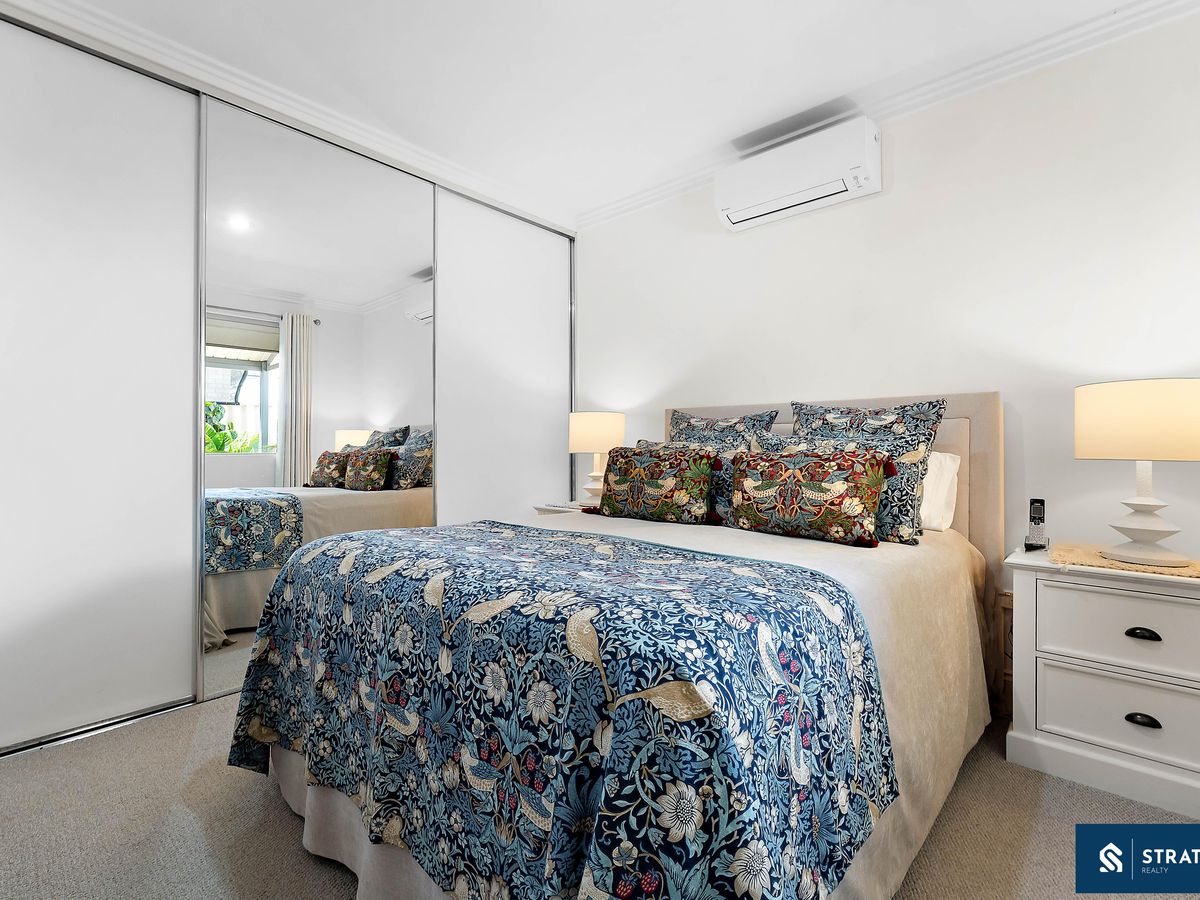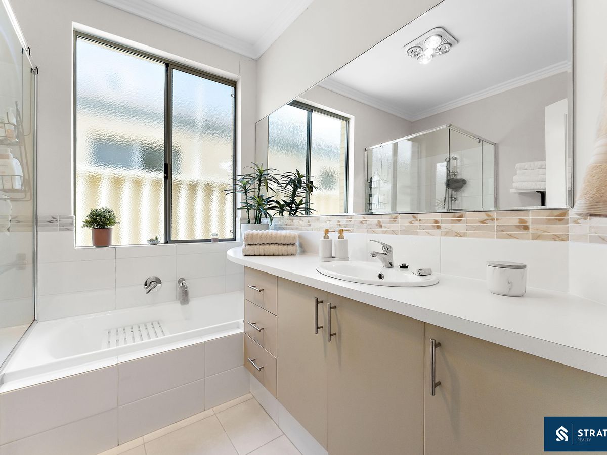 The master bedroom features carpet flooring, split-system air conditioning, and a generous triple mirrored built-in wardrobe, while the third bedroom is also well sized and offers carpet flooring, split-system air conditioning, and a double mirrored built-in wardrobe. The bathroom is well designed and includes a shower, bathtub, toilet, and large mirror. A separate linen closet and a well-appointed laundry with ample cabinet space add to the home's practical layout.