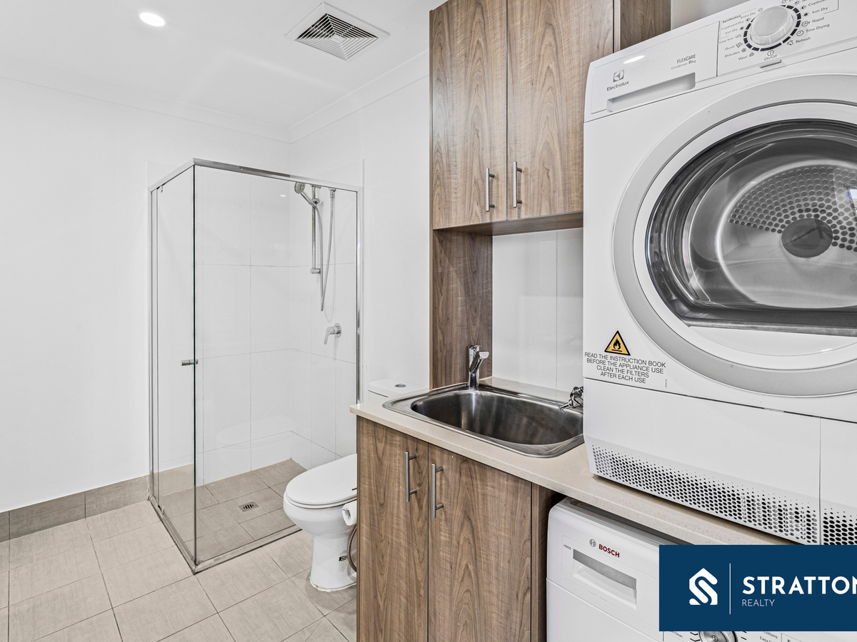 -Combined bathroom and laundry with oversized shower and stone benchtop