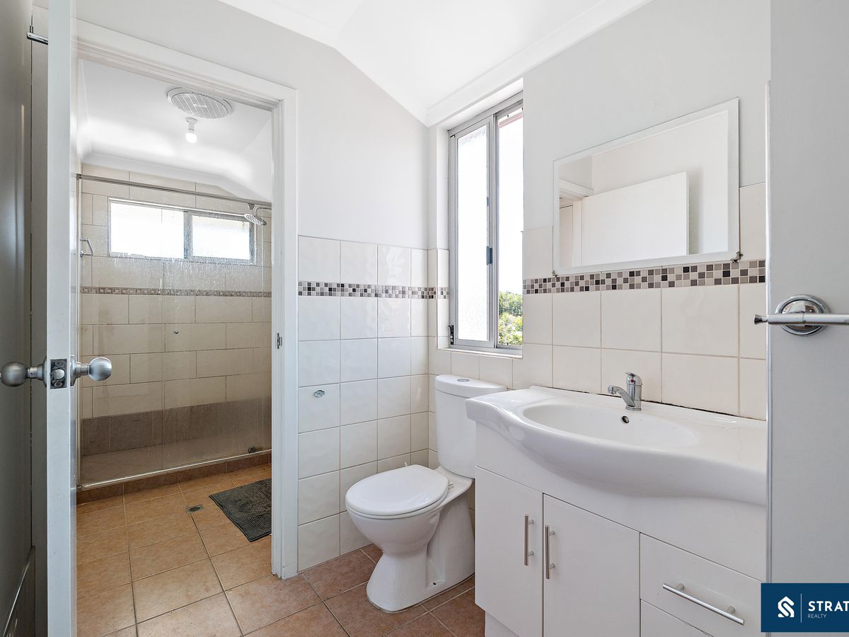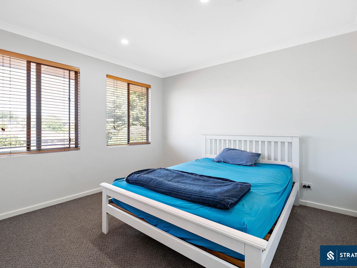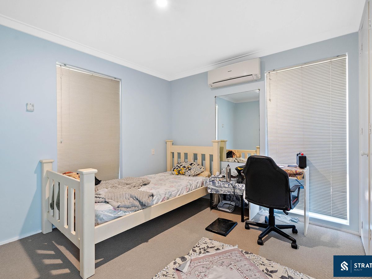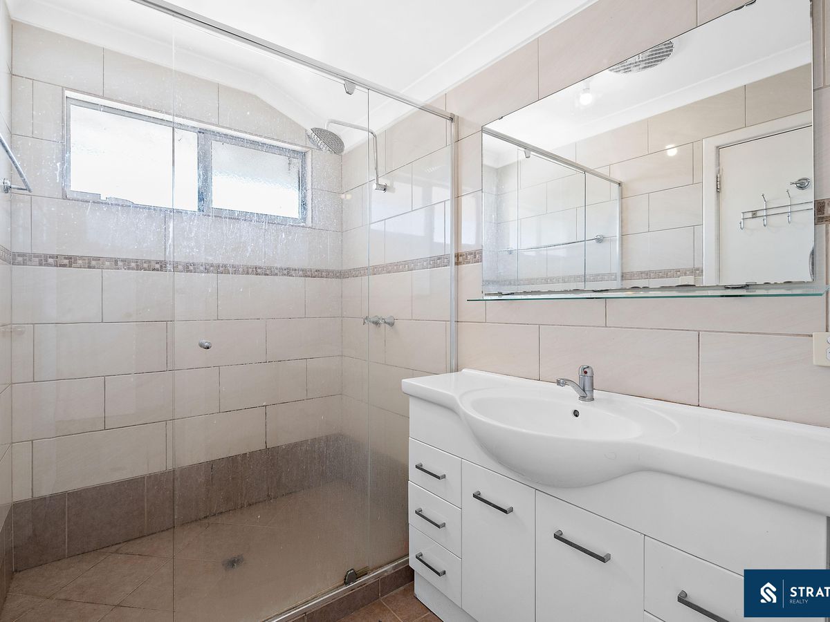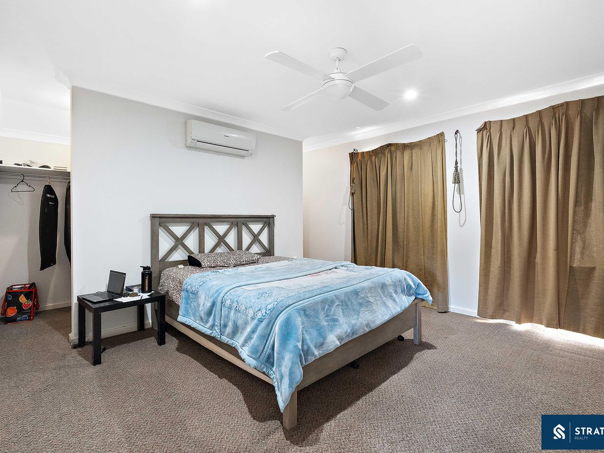All bedrooms are well proportioned and finished with carpet flooring. One bedroom features a double built-in wardrobe, while another includes a triple built-in wardrobe and split system air conditioning. A third bedroom is fitted with roller shutters, a ceiling fan, split system air conditioning and a triple built-in wardrobe, along with its own private ensuite finished with floor-to-ceiling tiles. Another spacious bedroom also includes a triple built-in wardrobe. Upstairs is carpeted for comfort, enhancing the warm and inviting feel of the home.