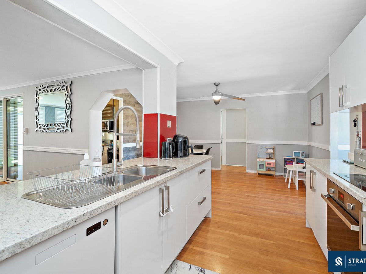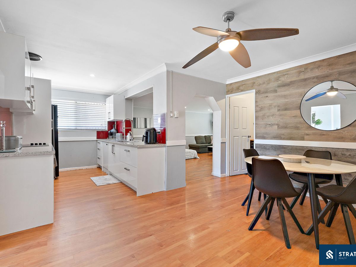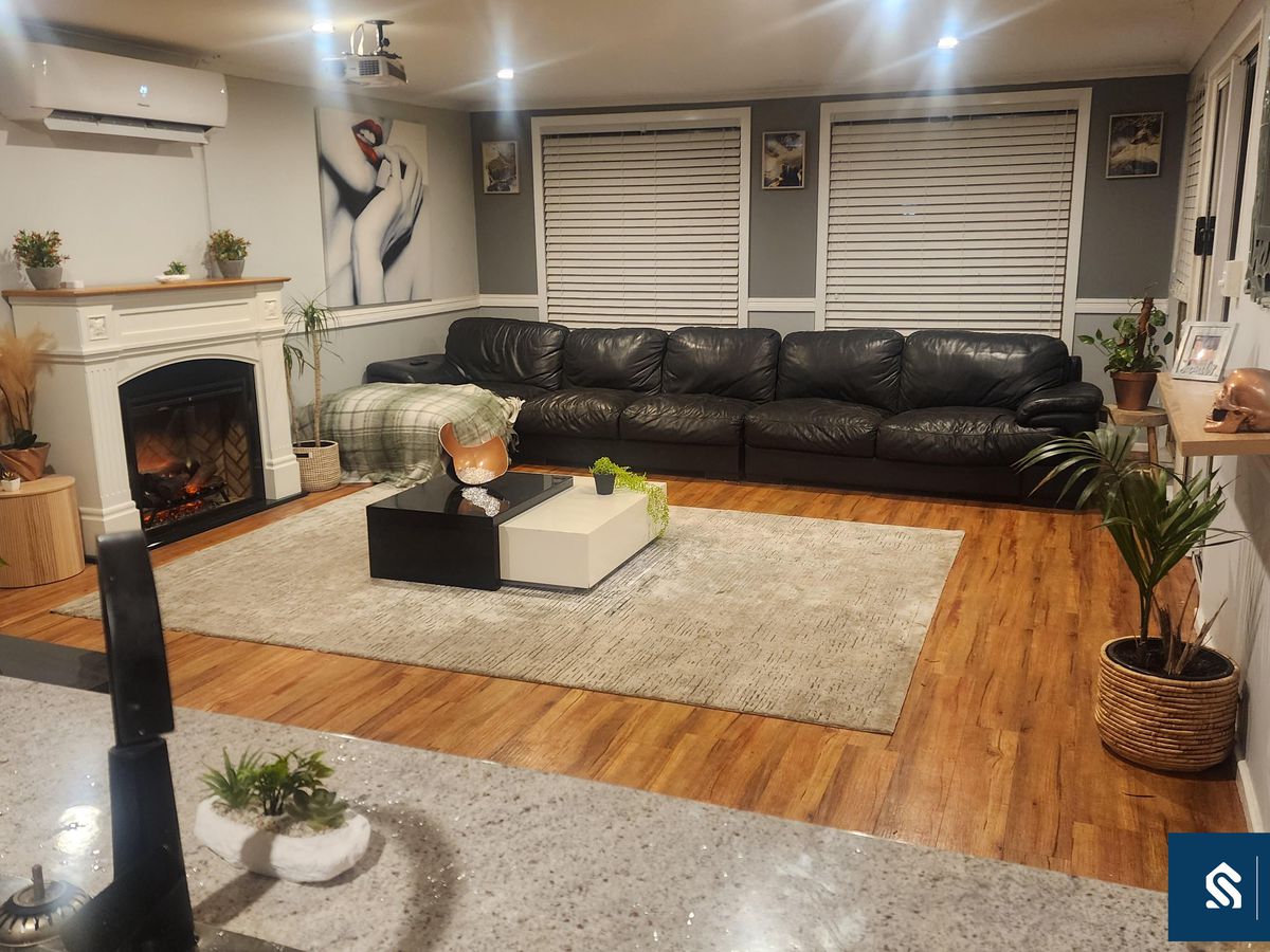 The adjoining meals area is well sized and complete with a ceiling fan, making it a comfortable spot for family dinners. A separate living room provides additional space for relaxation and features LED downlights and a split system air conditioner for year-round comfort.
