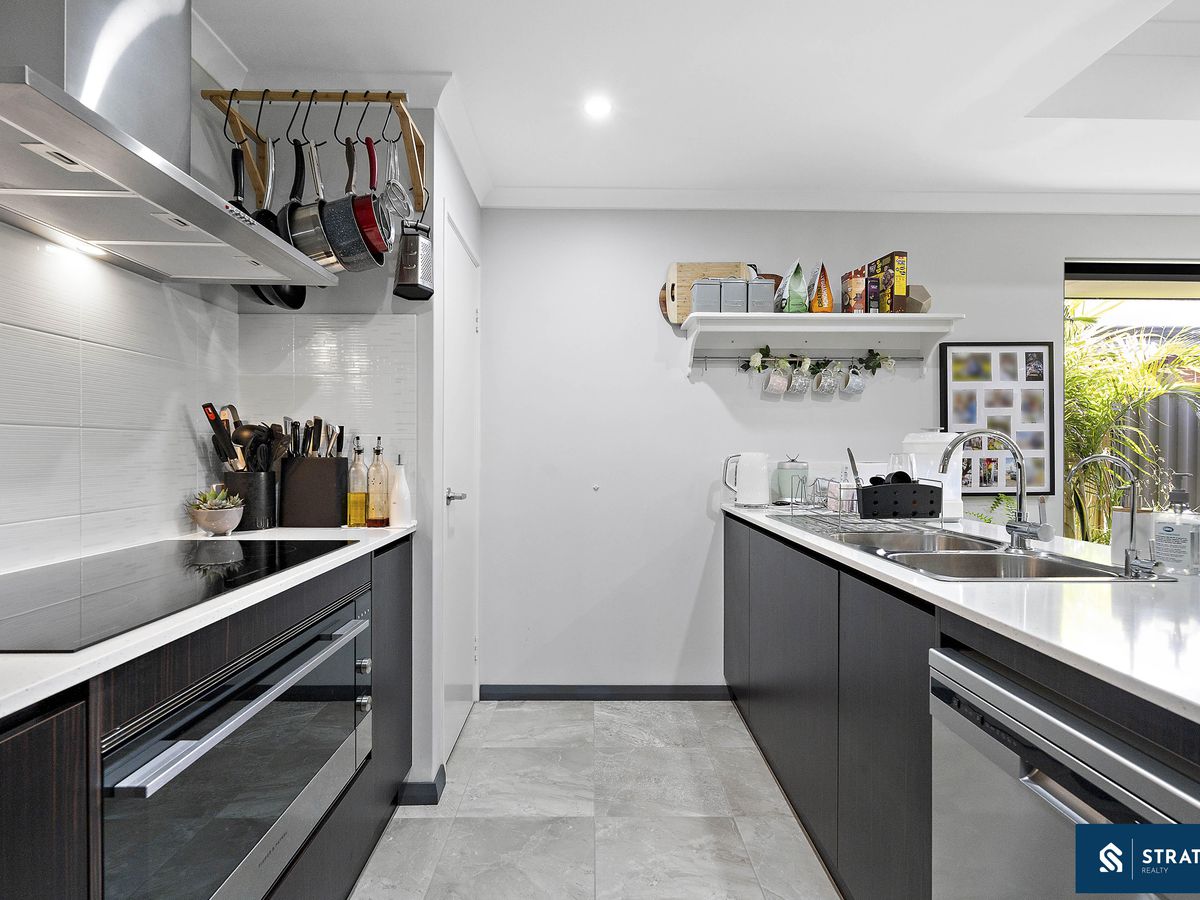 The well-appointed kitchen offers an electric cooktop, double sink with water filter, built-in pantry, and ample cabinetry, ensuring plenty of preparation and storage space for the home chef.