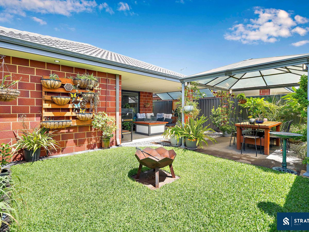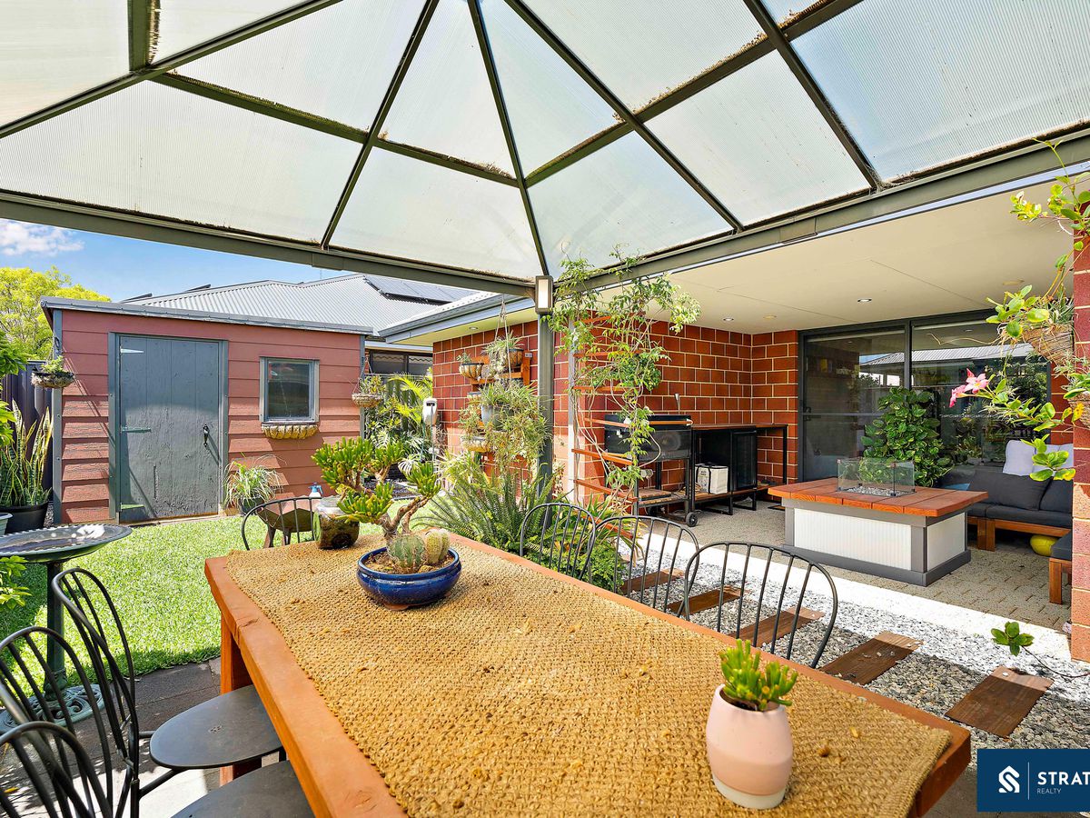 Stepping outside, you'll find a generous alfresco area overlooking a grassed backyard, perfect for children, pets, or weekend entertaining. The backyard also includes a patio area and a garden shed, offering extra space and functionality.