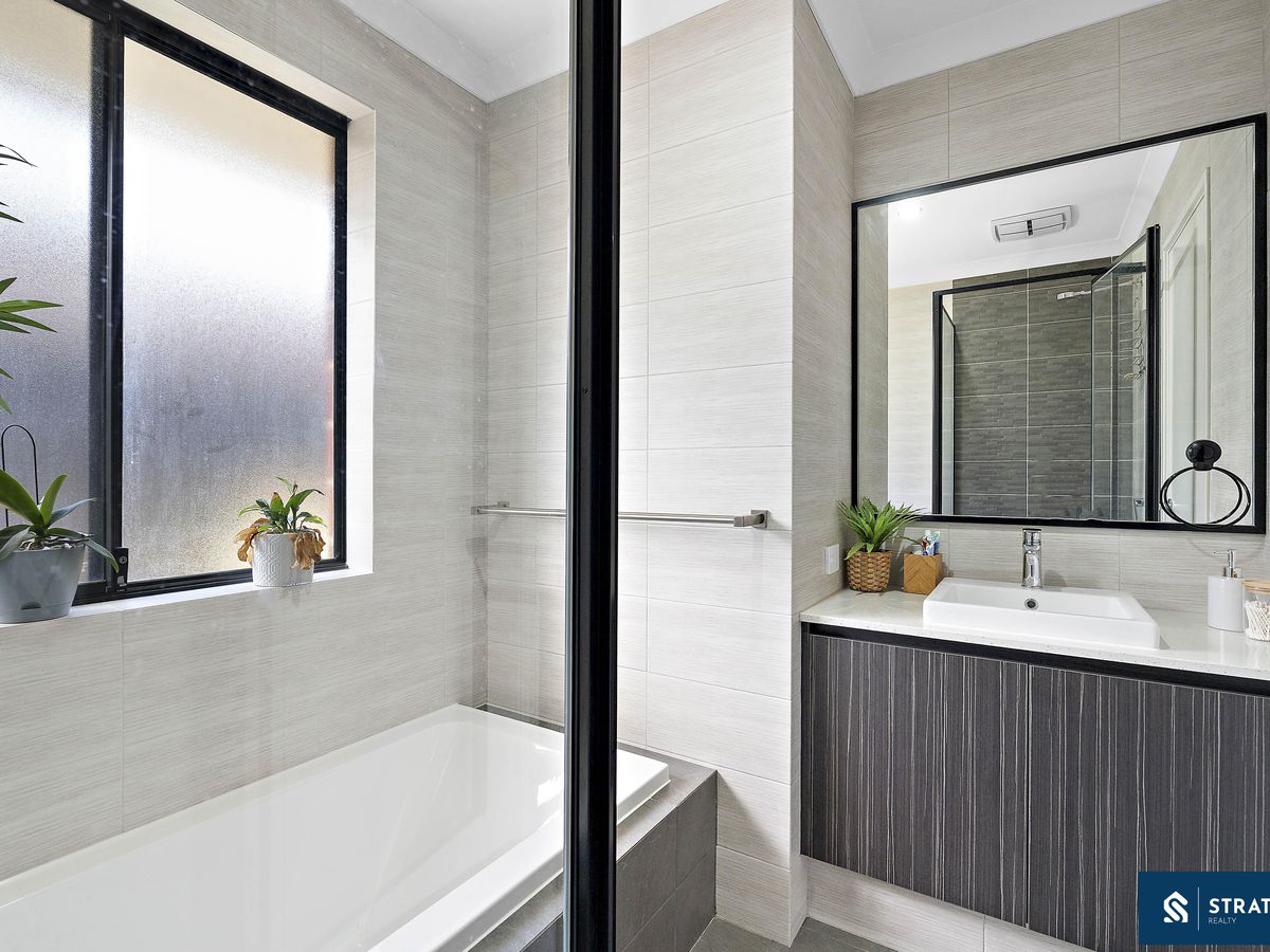 The main bathroom is beautifully finished with floor-to-ceiling tiles, a shower, bathtub, and a basin with stone benchtop, while the separate toilet also features full-height tiling for a seamless modern look. A well-sized laundry provides a basin sink, additional storage, and convenient side door access. A built-in linen closet in the hallway further enhances the home's practical storage solutions.