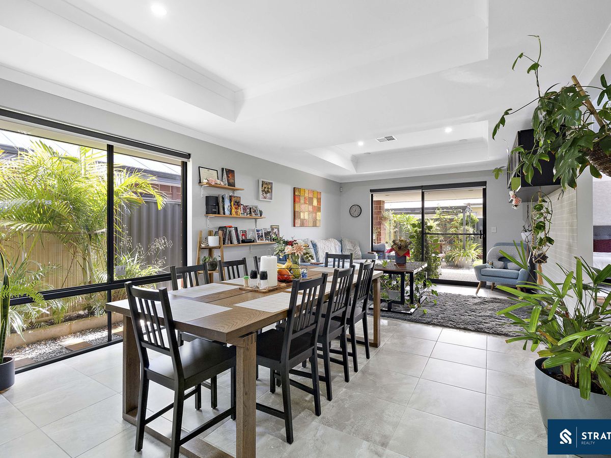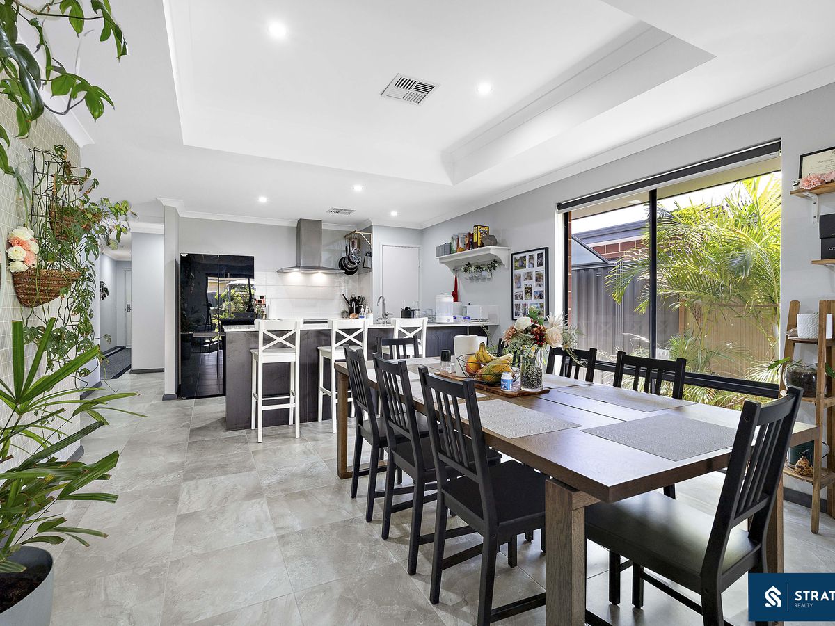 At the heart of the home, the spacious living room showcases hybrid flooring and a cosy fireplace, creating a warm and inviting atmosphere for family gatherings. The open-plan meals and living area is enhanced by recessed ceilings, adding a sense of space and natural light, making it ideal for both everyday living and entertaining.