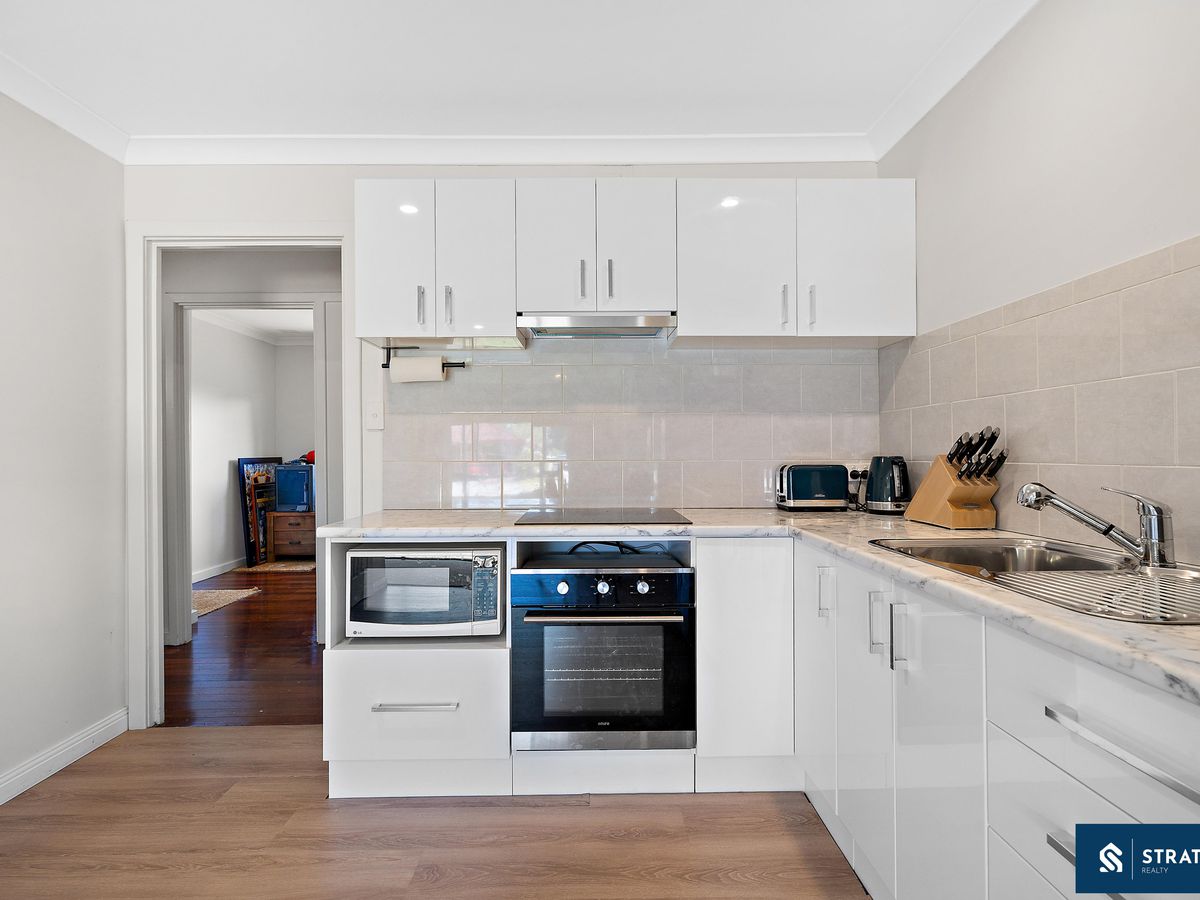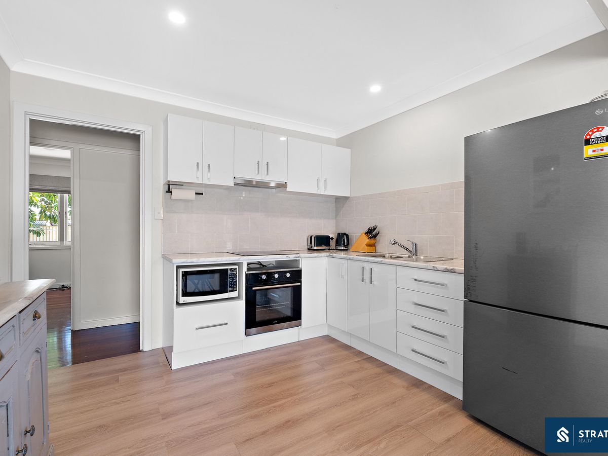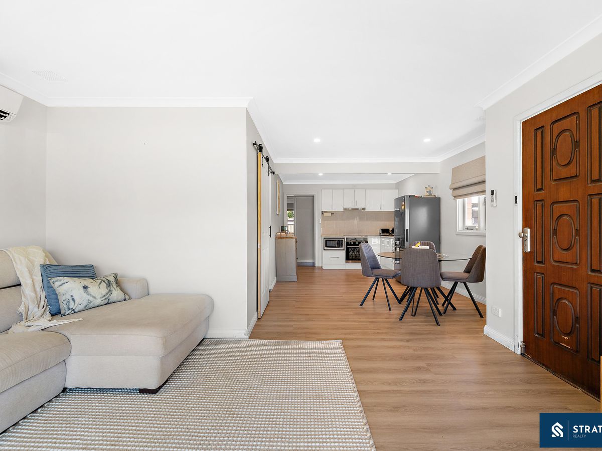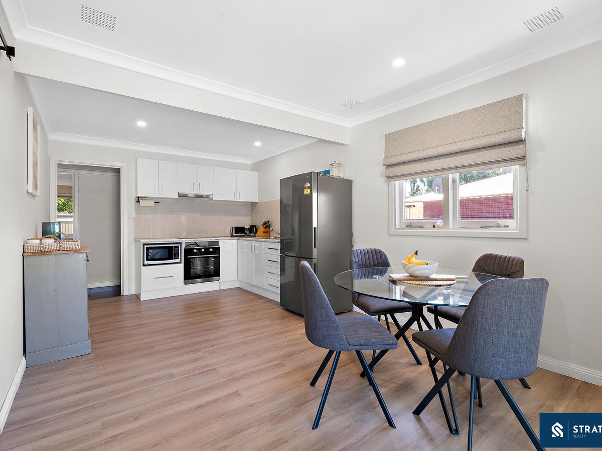 Stepping inside through the front door with a security screen, the home opens into a well-sized living and meals area featuring hybrid flooring and a split system air conditioner, creating a comfortable space for everyday living. This area flows nicely into the renovated kitchen, which is well designed with an electric cooktop, plenty of cabinet space, and a practical layout for meal preparation. LED downlights installed throughout the kitchen, living, and meals area add a modern touch and enhance the bright and welcoming feel of the home.