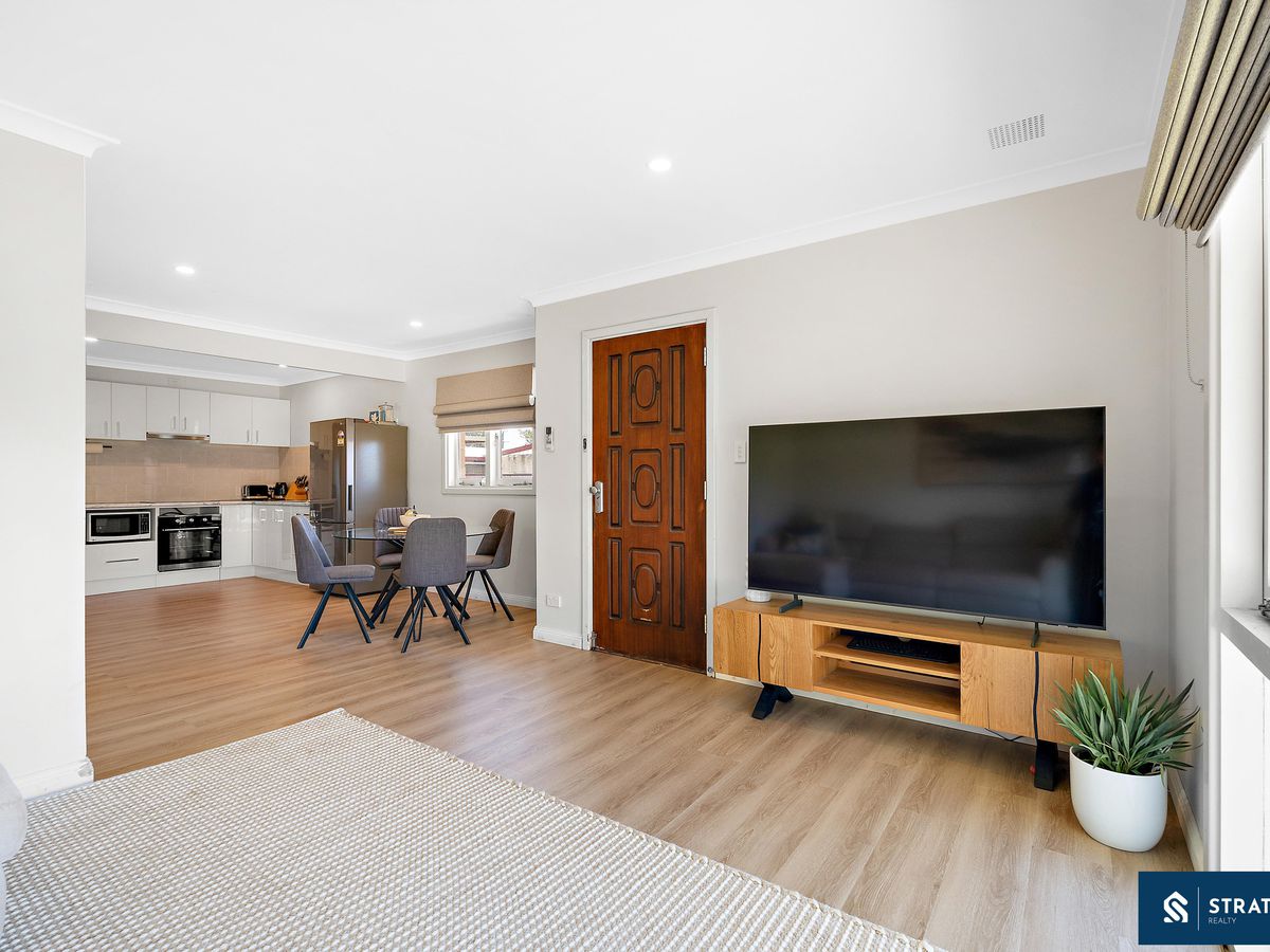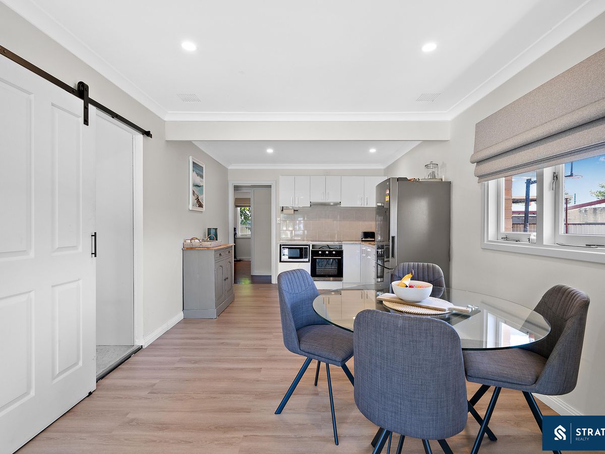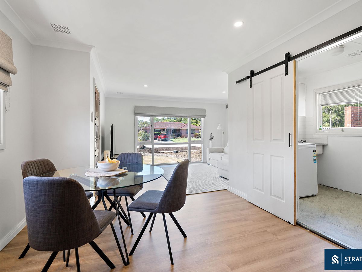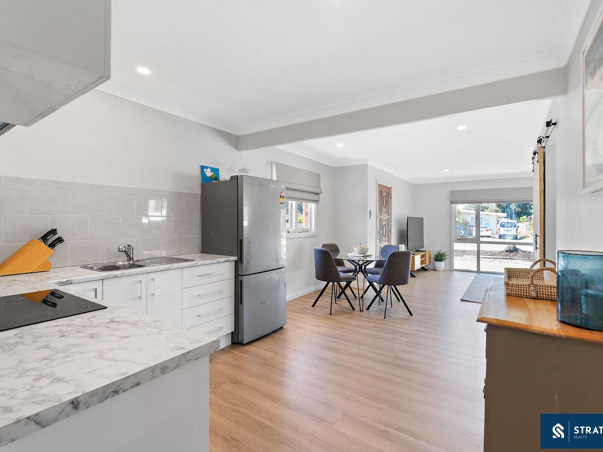 Stepping inside through the front door with a security screen, the home opens into a well-sized living and meals area featuring hybrid flooring and a split system air conditioner, creating a comfortable space for everyday living. This area flows nicely into the renovated kitchen, which is well designed with an electric cooktop, plenty of cabinet space, and a practical layout for meal preparation. LED downlights installed throughout the kitchen, living, and meals area add a modern touch and enhance the bright and welcoming feel of the home.