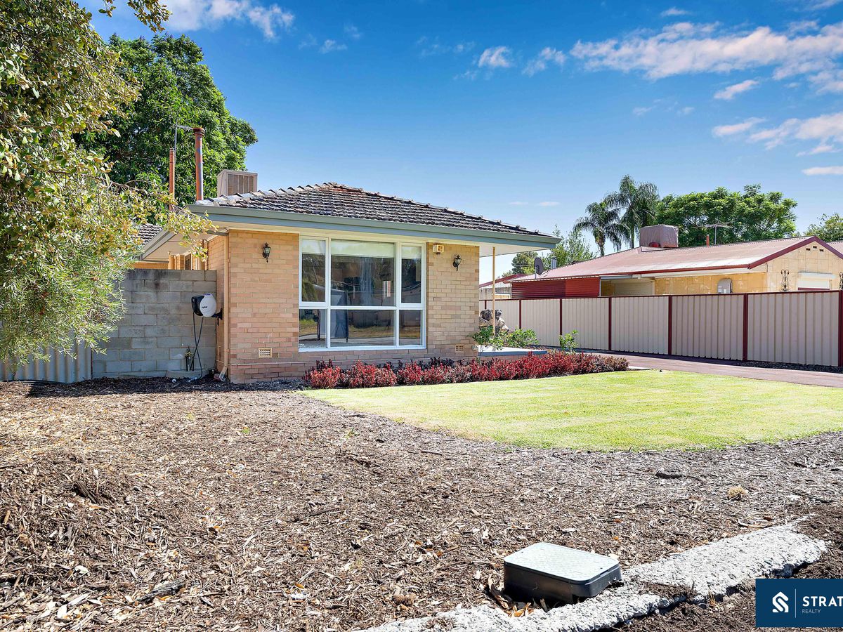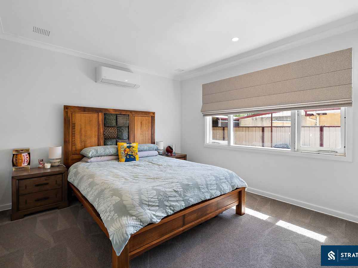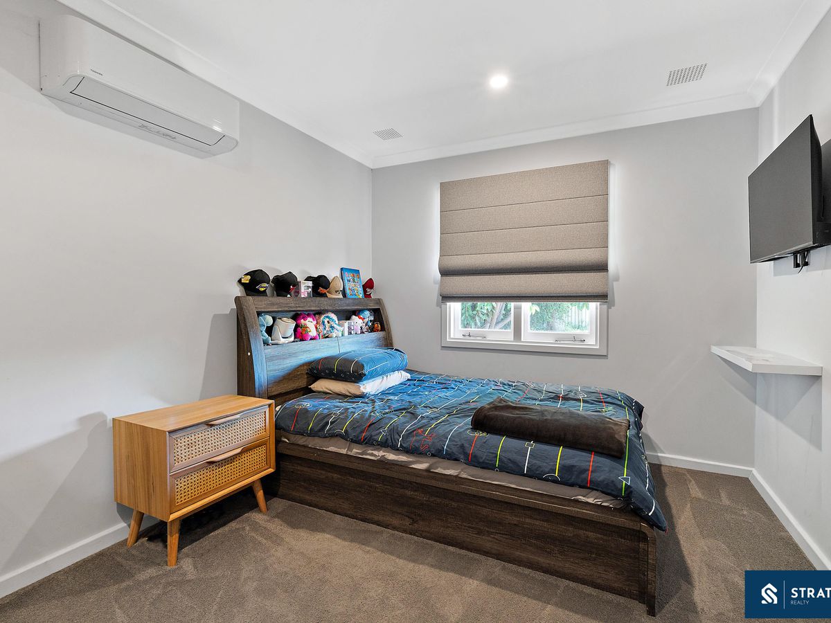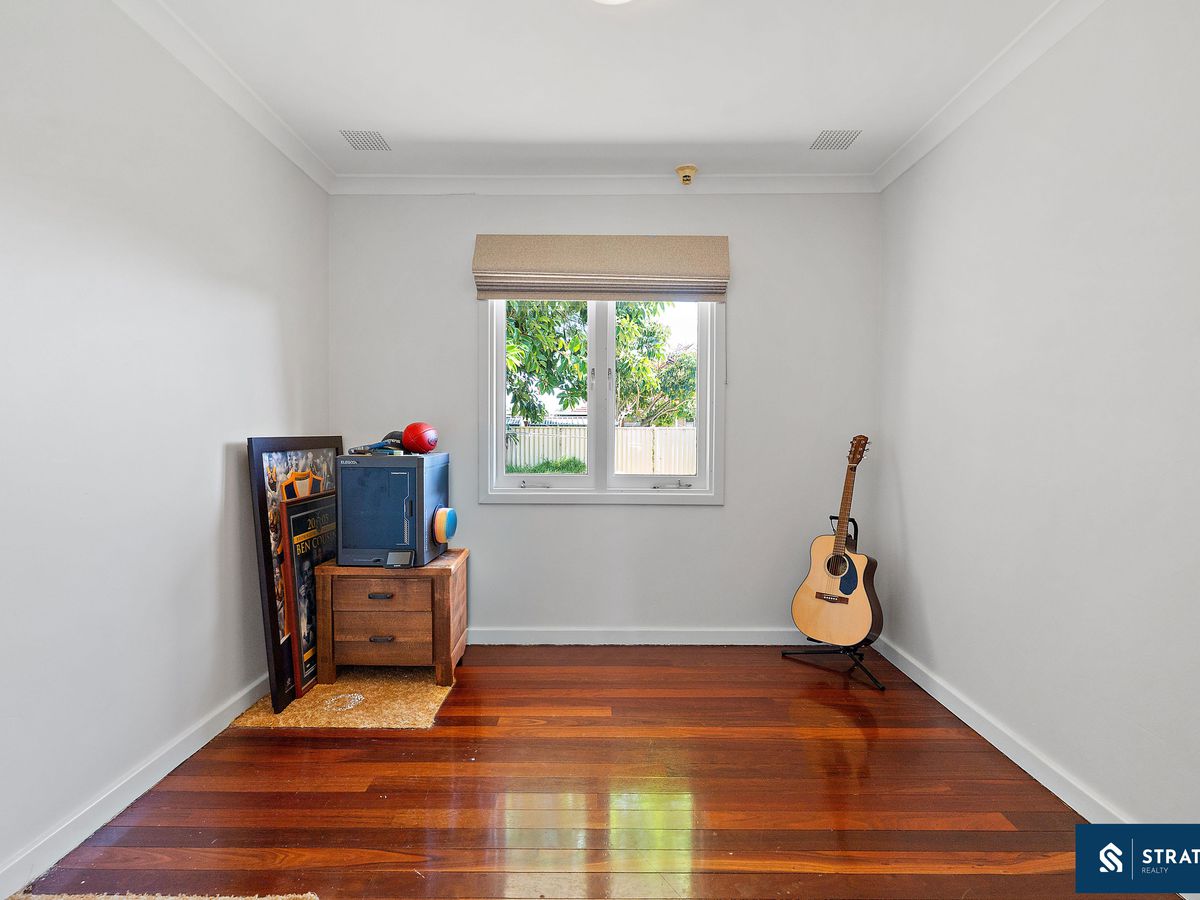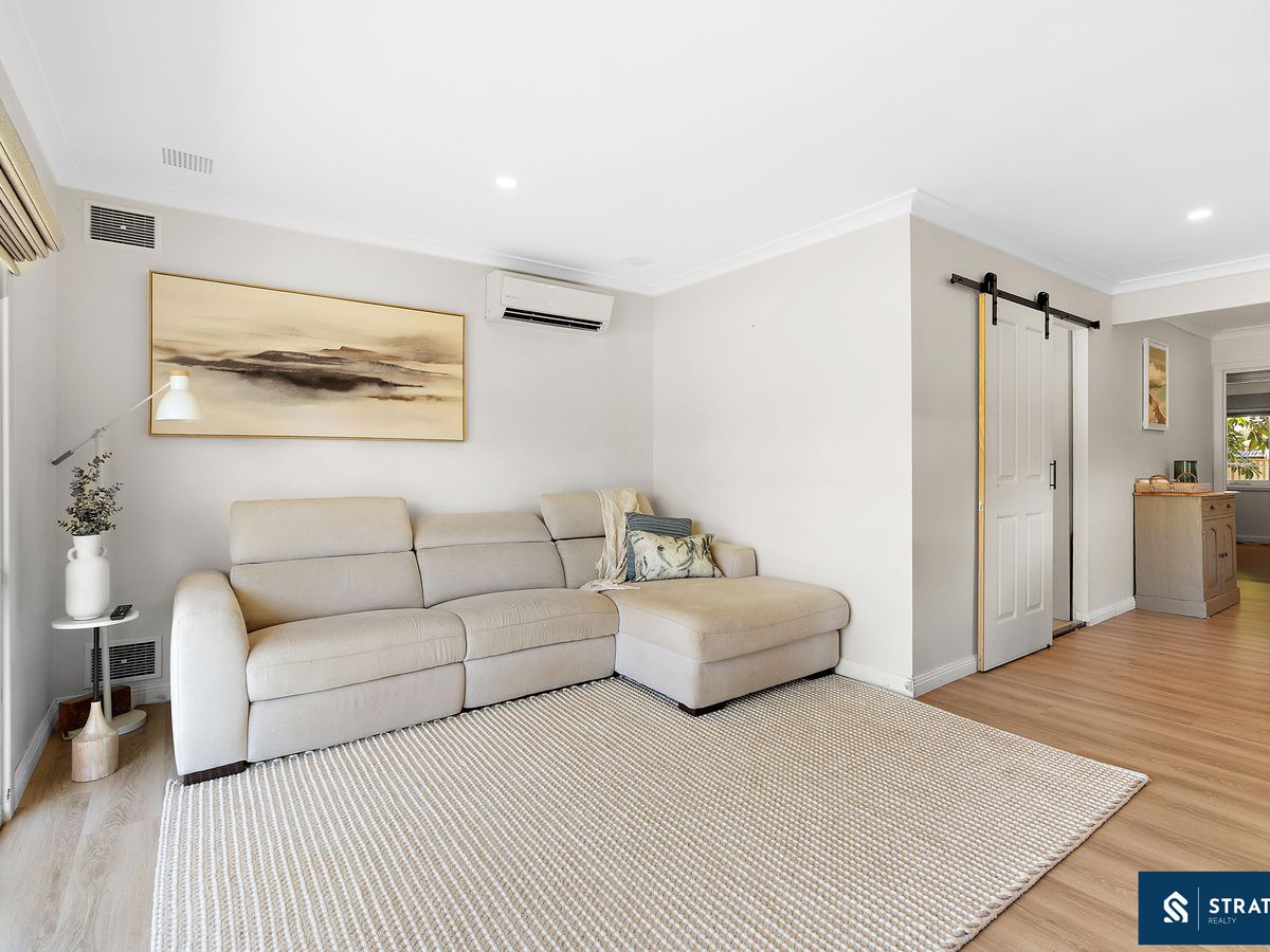The property features three well-sized bedrooms. Bedroom one includes carpet flooring, LED downlights, and a split system air conditioner for year-round comfort. The master bedroom is also generously sized and fitted with its own split system air conditioner. Bedroom three is well sized and finished with classic jarrah flooring. The hallway connecting the bedrooms also showcases beautiful jarrah flooring and includes a convenient built-in linen closet for additional storage.
