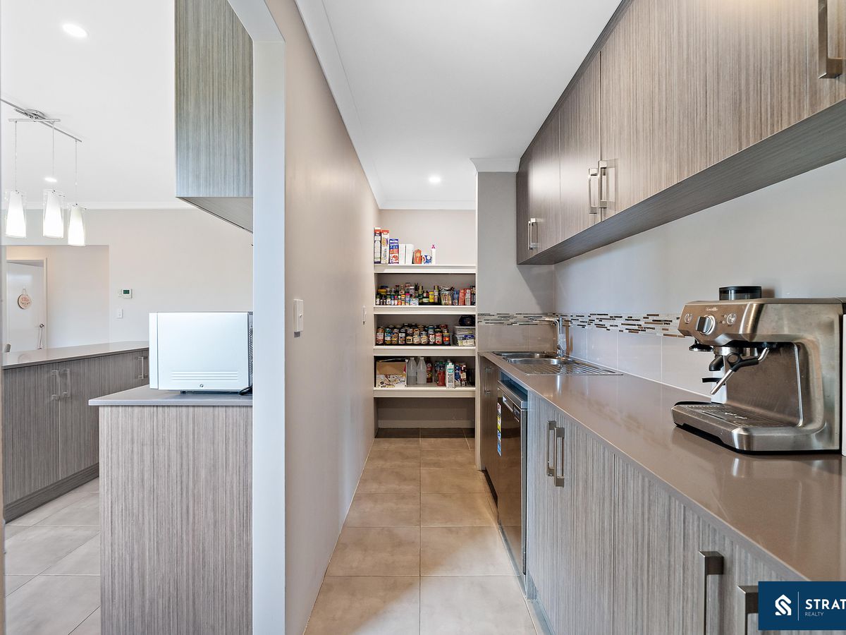 The kitchen is well designed and equipped with an induction cooktop, ample cabinet space, and a seamless connection to the spacious scullery, which includes a dishwasher, extensive storage, and a well-sized pantry at the end-ideal for keeping the main kitchen area clean and organised.