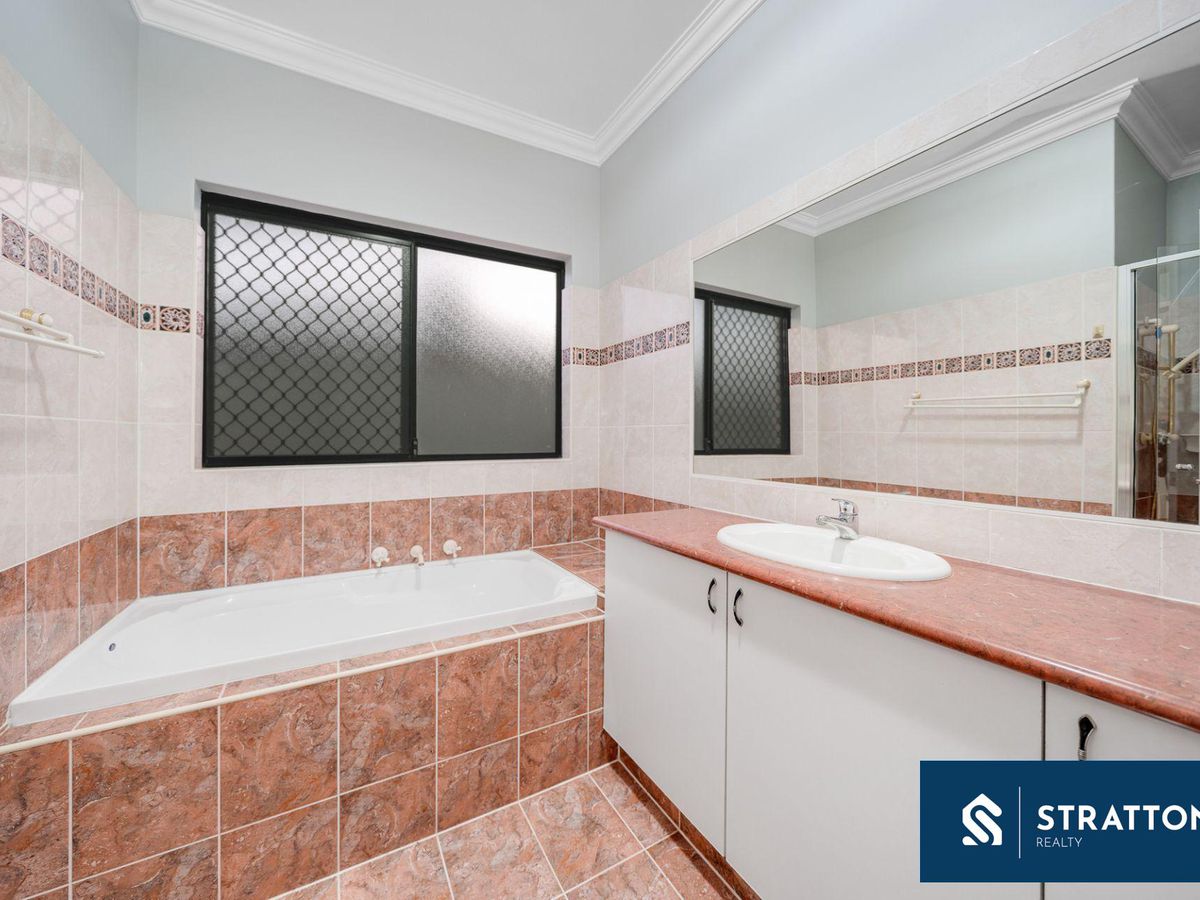 The spacious master suite is a true highlight, featuring a large walk-in robe and a luxurious ensuite with floor-to-ceiling tiles, a spa bath, and a separate shower for ultimate relaxation. The three remaining bedrooms are generously sized, each with built-in wardrobes, plush carpet, and plenty of natural light, offering comfortable living spaces for family members or guests.