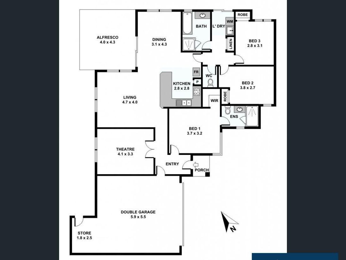 The spacious theatre room, complete with double doors and carpet flooring, provides an ideal setting for movie nights or relaxation. The open-plan living and meals areas are generously sized, featuring a split-system air conditioner to ensure comfort throughout the year. A backdoor with a security screen allows seamless access to the alfresco, creating a perfect space for outdoor entertaining.
