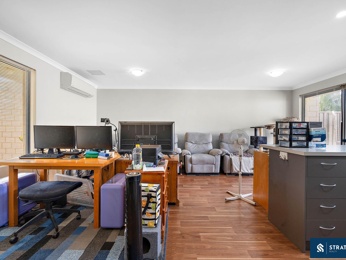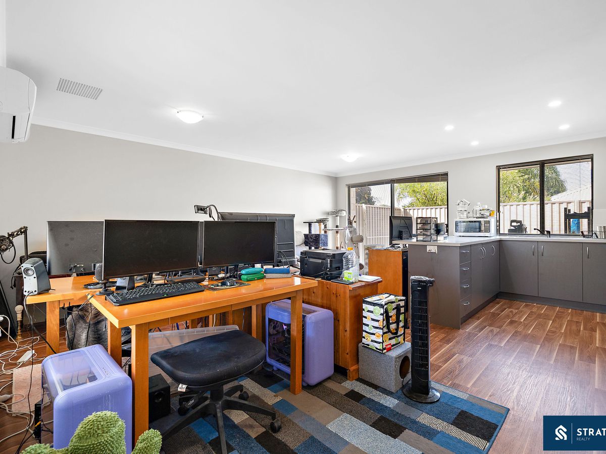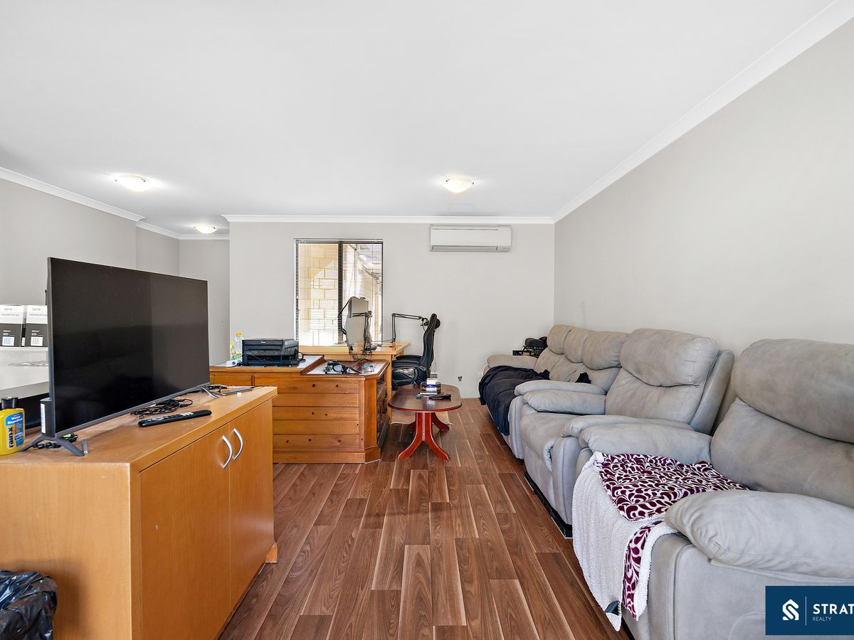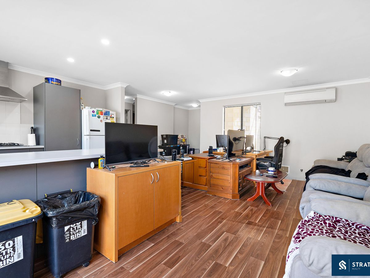 Inside, the home opens into a central open-plan living, dining and kitchen area, finished with hybrid flooring that continues through the main living spaces and hallways for a modern and easy-care finish. The kitchen is well equipped with a gas cooktop, double sink, built-in pantry, and ample cabinetry, offering plenty of storage and functionality for everyday use. A split system air-conditioning unit services the main living area.