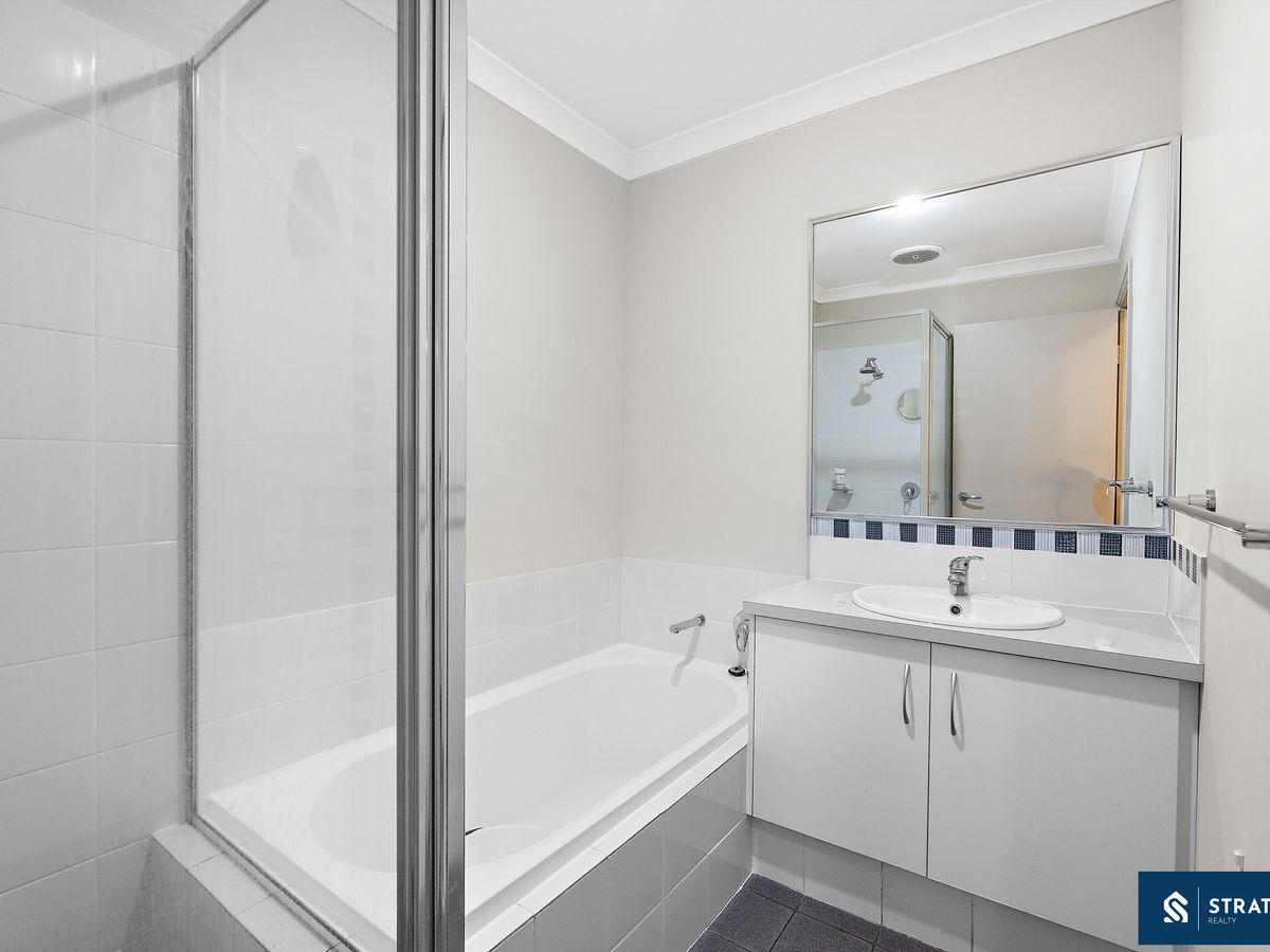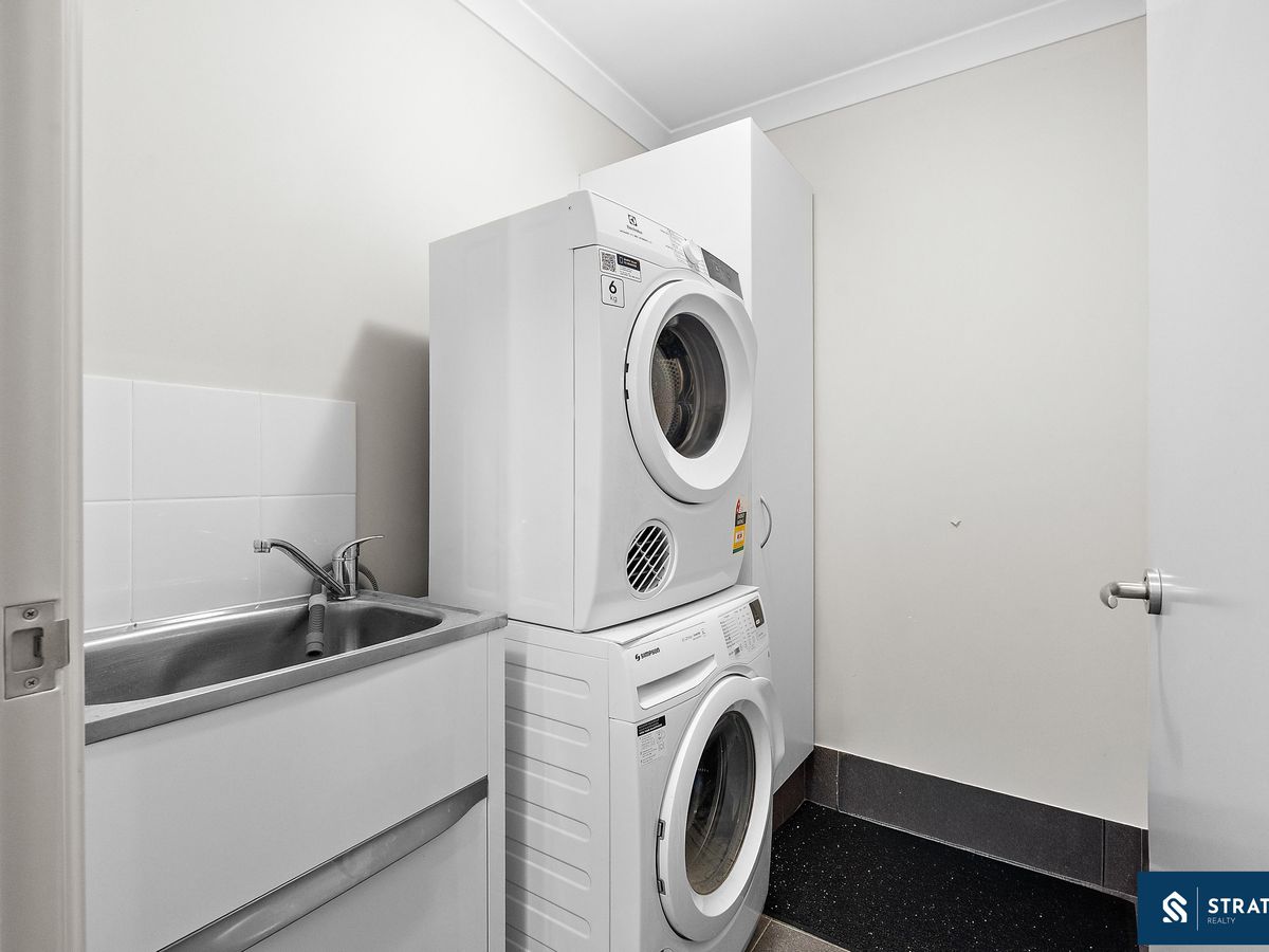 The main bathroom is centrally located and includes both a shower and a bathtub, while a separate toilet adds convenience for shared living. The laundry is positioned internally, finished with tiled flooring, and includes a sink for added practicality.