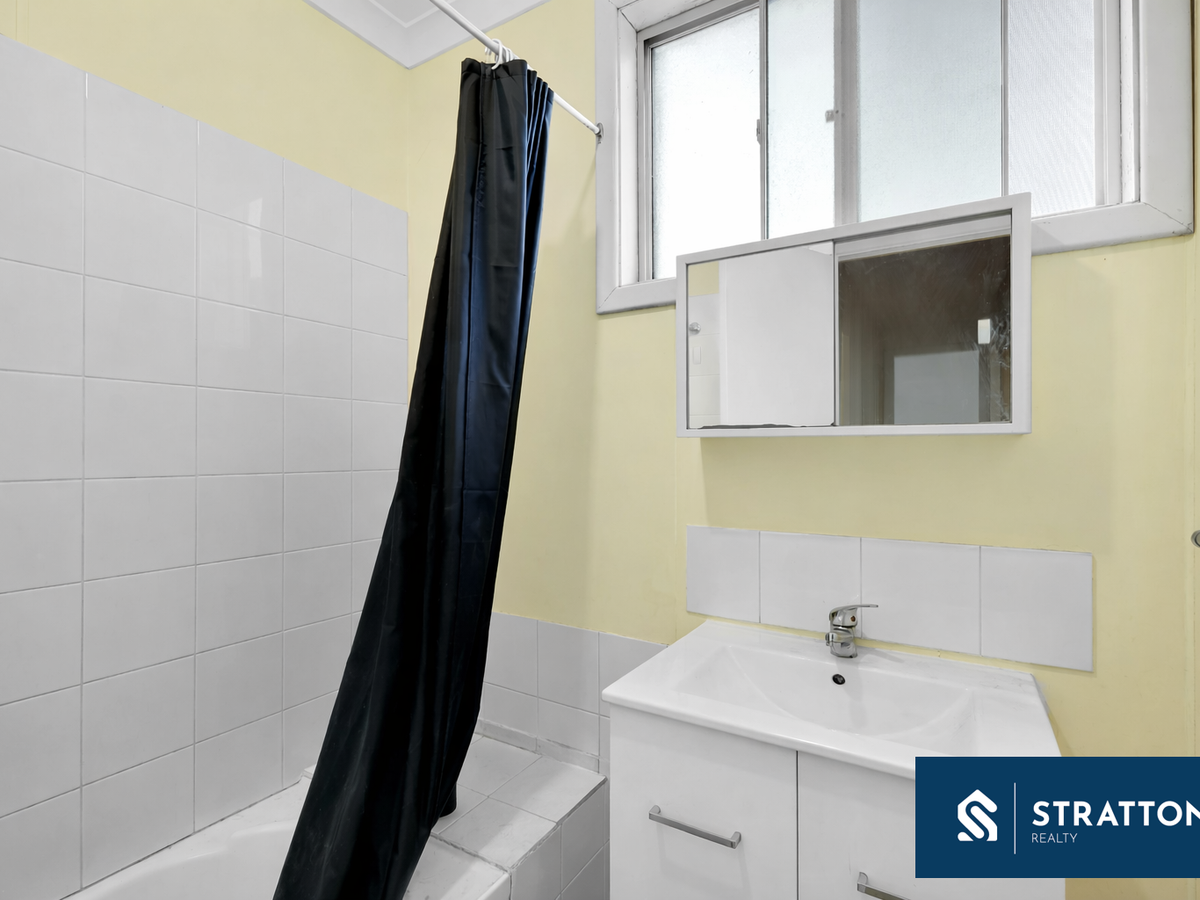 The bathroom is designed for practicality, featuring a combined shower and bath, while the toilet is conveniently located separately next to the laundry. The laundry itself is well-sized and tiled, complete with a built-in linen cupboard and direct side access to the backyard, adding to the home's everyday functionality.