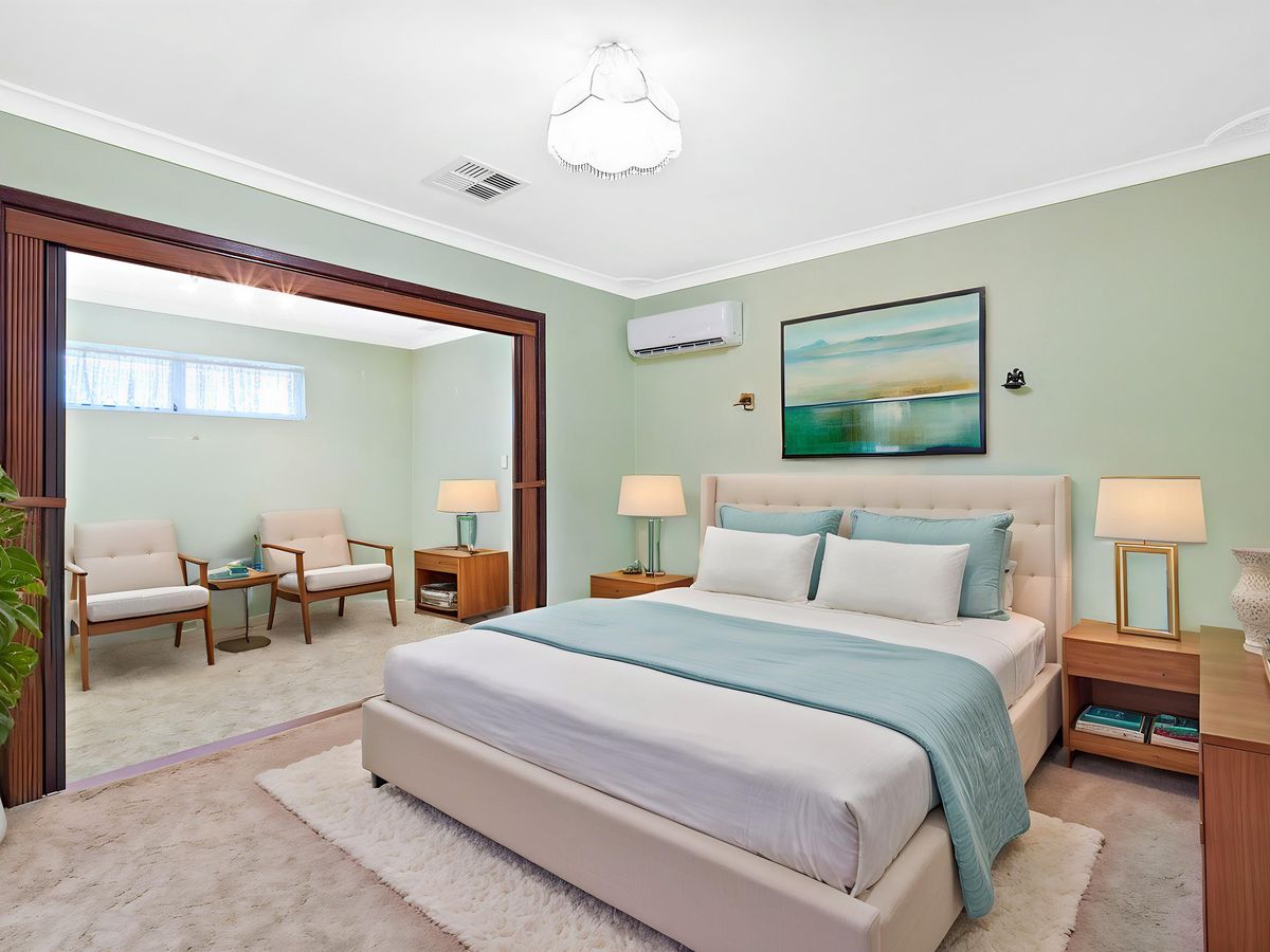 The accommodation includes three bedrooms, all carpeted and well proportioned. The master bedroom is particularly functional, offering a large double-door wardrobe, split system air-conditioning, and a unique step-down retreat space with direct access to the outdoor patio.