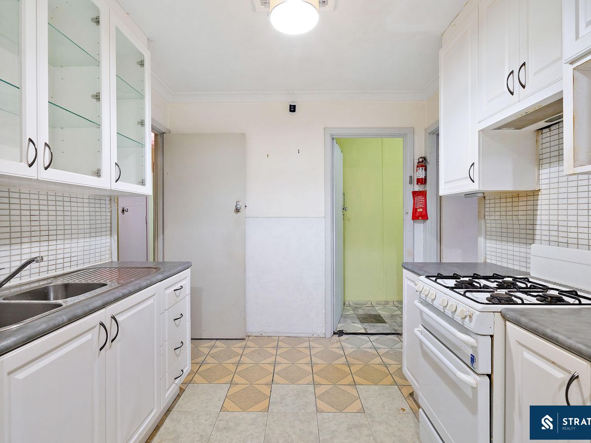 The kitchen is practical and spacious, featuring gas appliances, ample cabinetry, tiled flooring, and the added benefit of a large walk-in pantry or storage area.