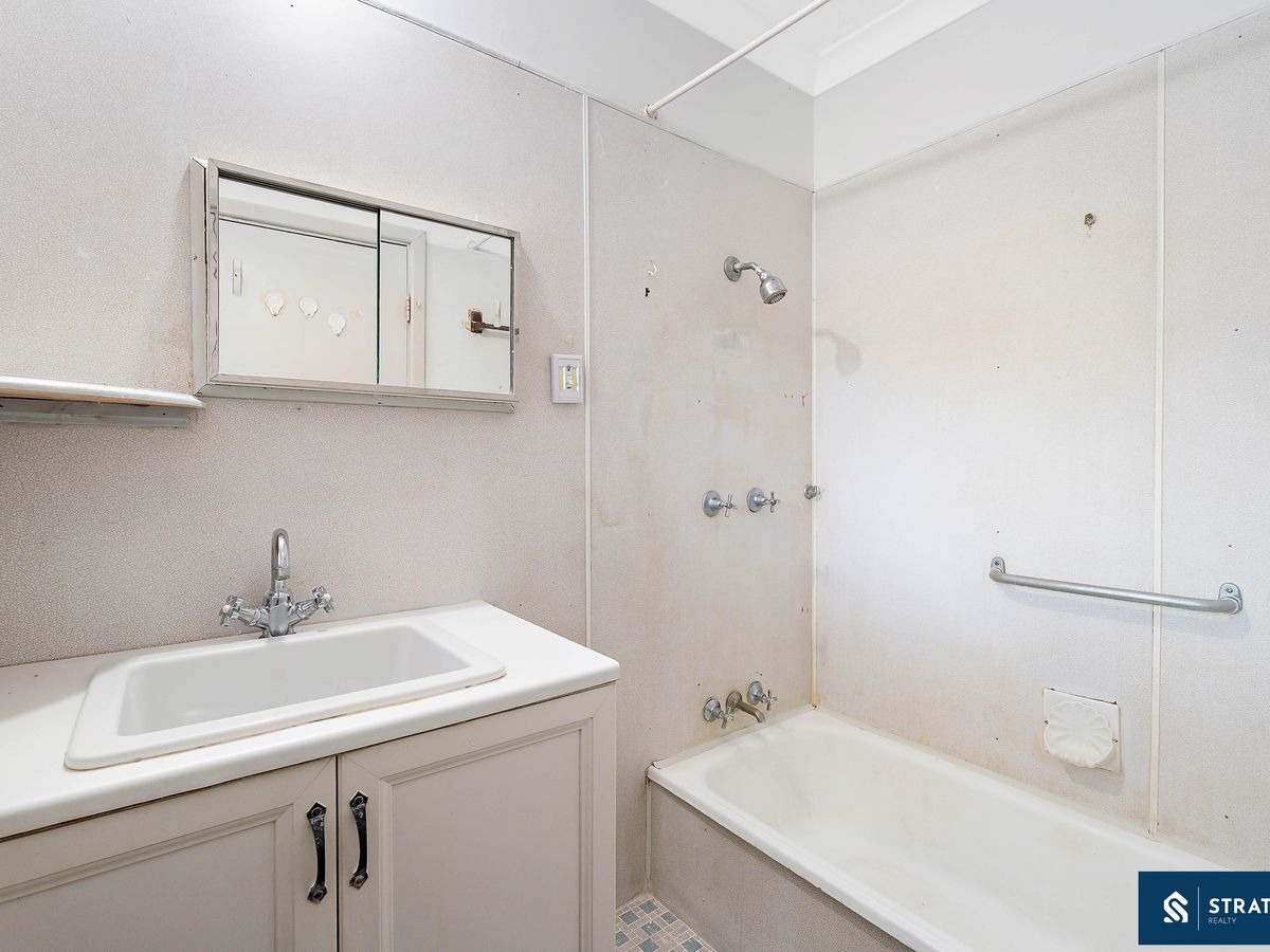The bathroom is well sized and includes a shower, bathtub, and vanity, while a separate toilet is conveniently located near the laundry.